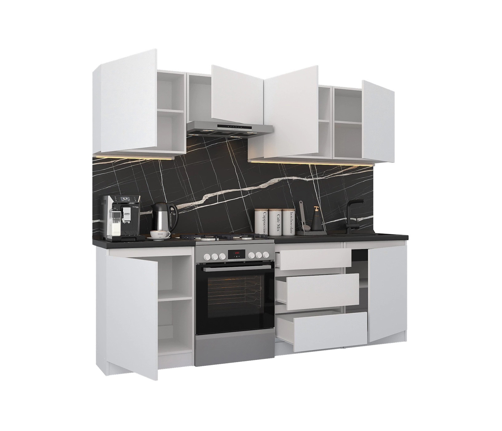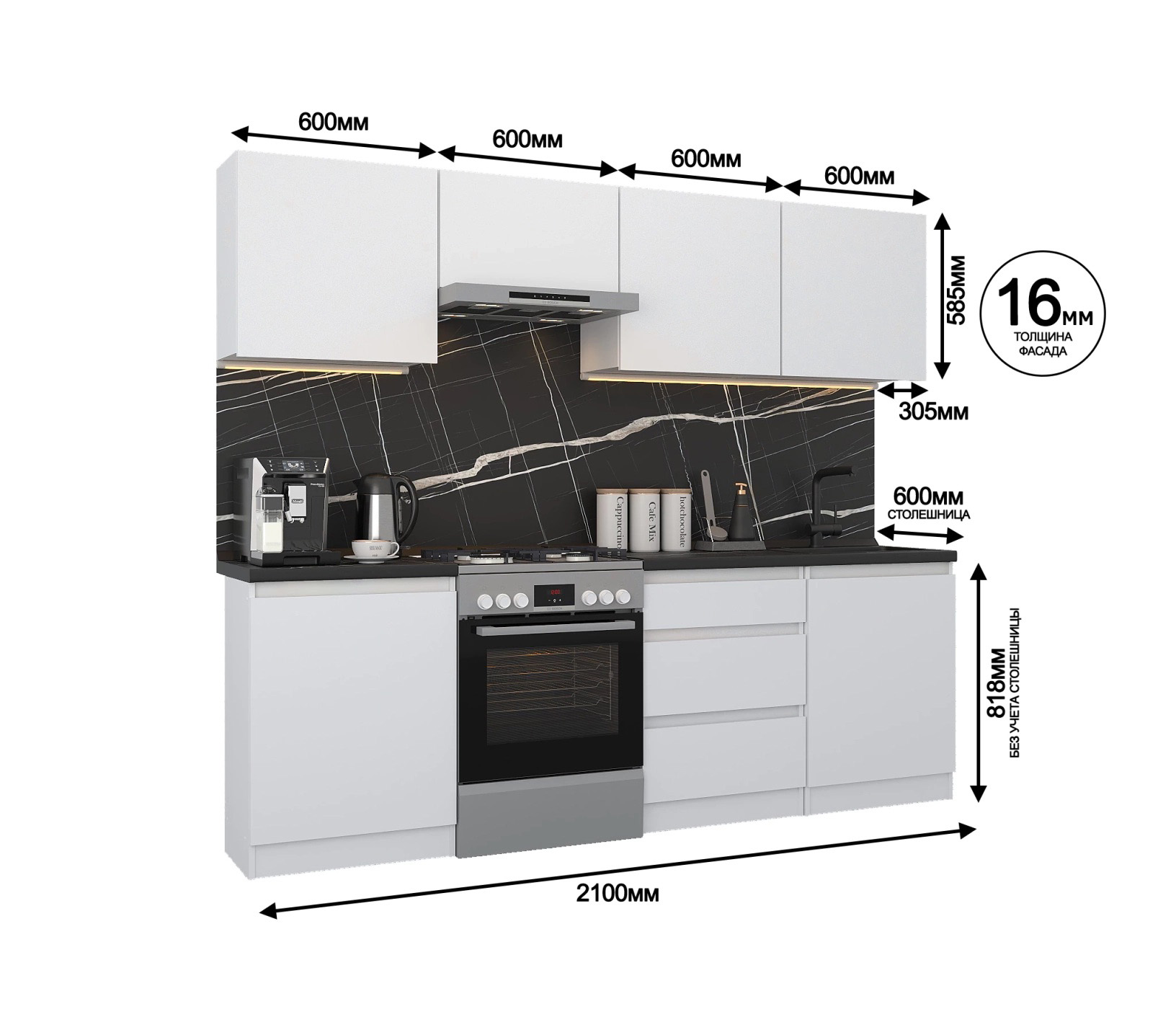 Кухня Леон сочетает в себе функциональность, стиль и доступность, и является прекрасным выбором для тех, кто ищет компактное и удобное решение для своей кухни. Кухонный гарнитур Леон идеально подходит для помещений с ограниченным пространством. Корпус и фасады выполнены из белого ЛДСП. Фасады столов и шкафов не имеют лицевой фурнитуры и открываются захватом за тыльный край фасада. Леон смотрится современно, а отсутствие ручек упрощает уход за поверхностью.