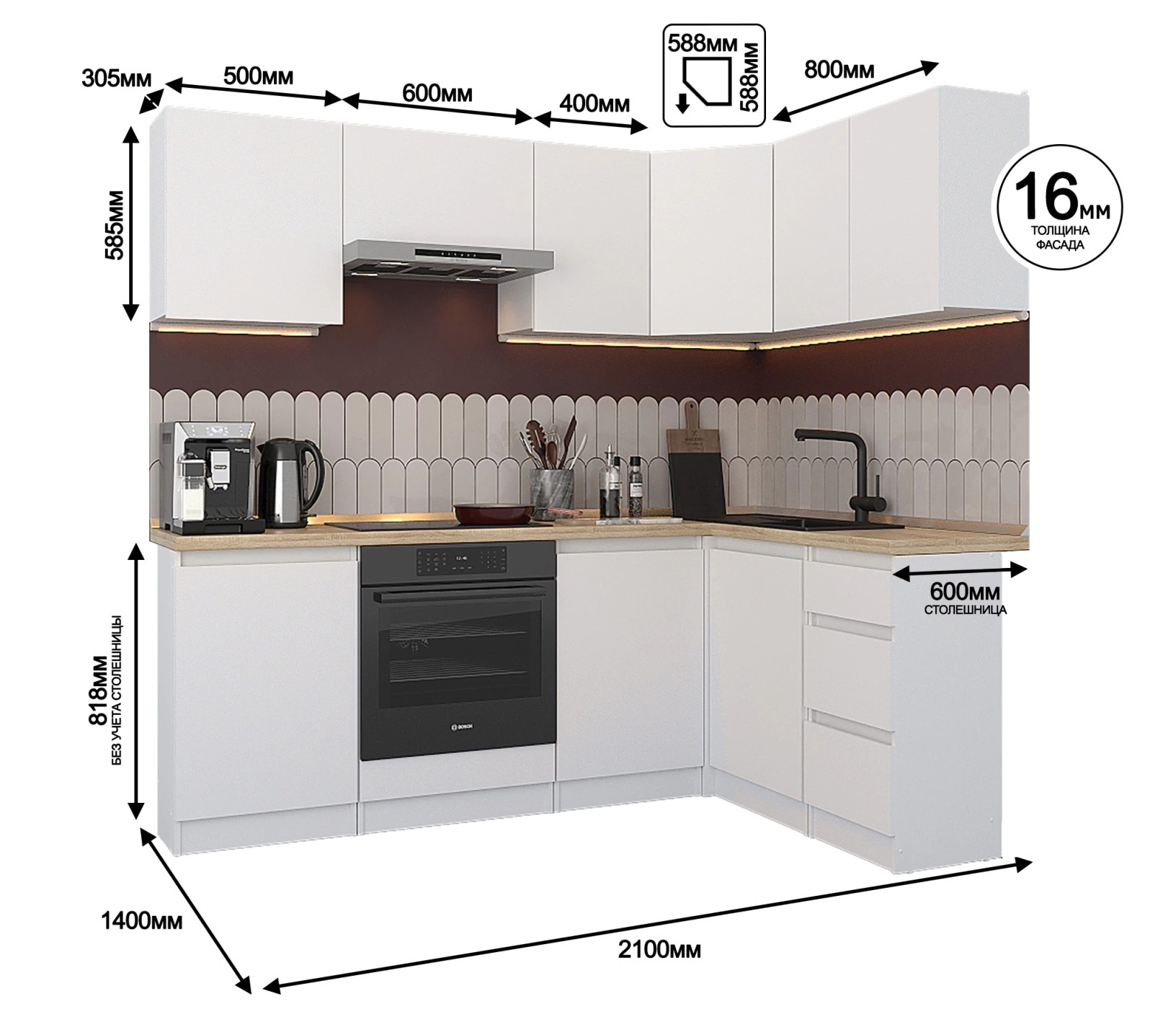 Кухонный гарнитур Леон угловой 210х140 см, белый (Белый)