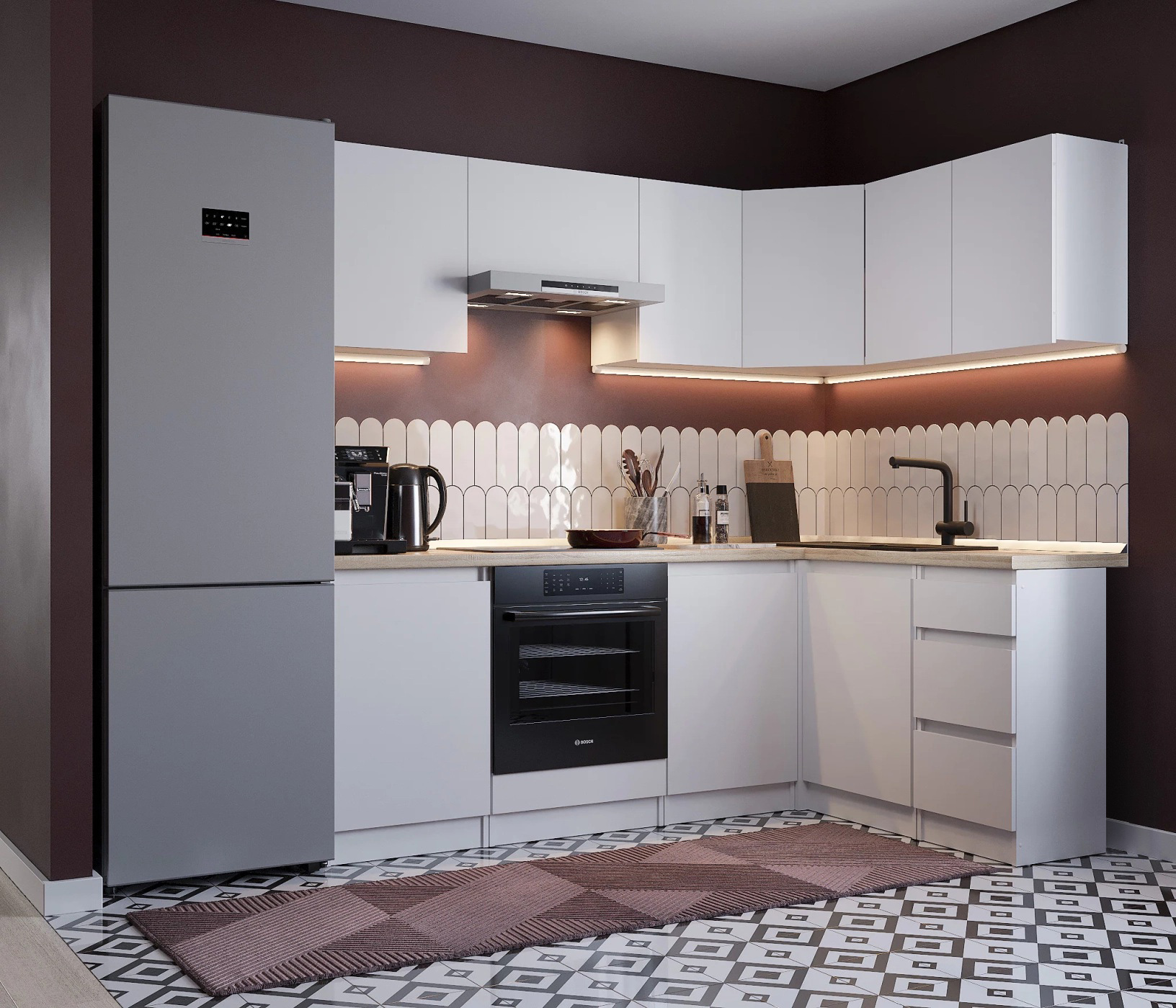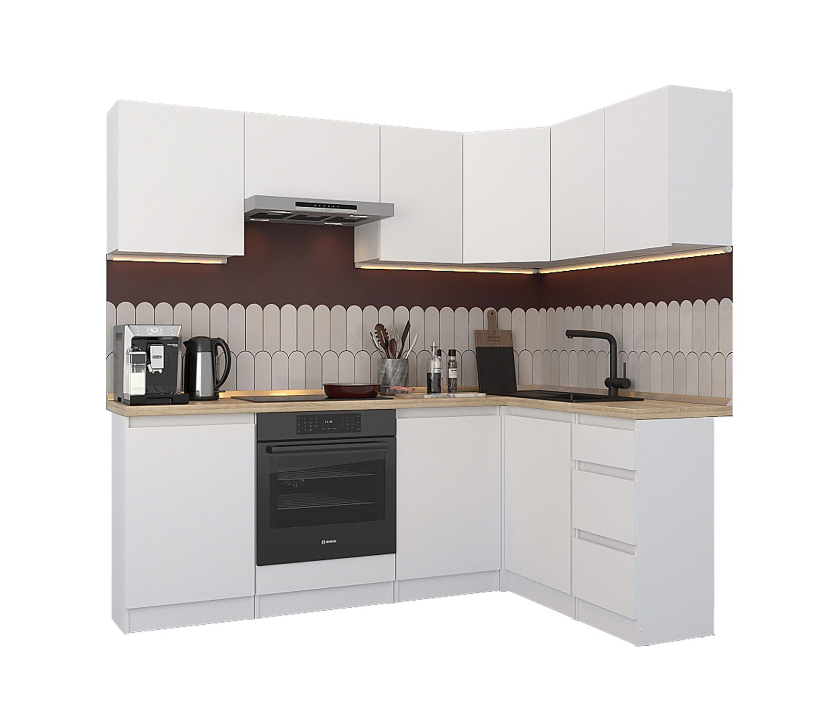 Кухня Леон сочетает в себе функциональность, стиль и доступность, и является прекрасным выбором для тех, кто ищет компактное и удобное решение для своей кухни. Кухонный гарнитур Леон идеально подходит для помещений с ограниченным пространством. Корпус и фасады выполнены из белого ЛДСП. Фасады столов и шкафов не имеют лицевой фурнитуры и открываются захватом за тыльный край фасада. Леон смотрится современно, а отсутствие ручек упрощает уход за поверхностью.