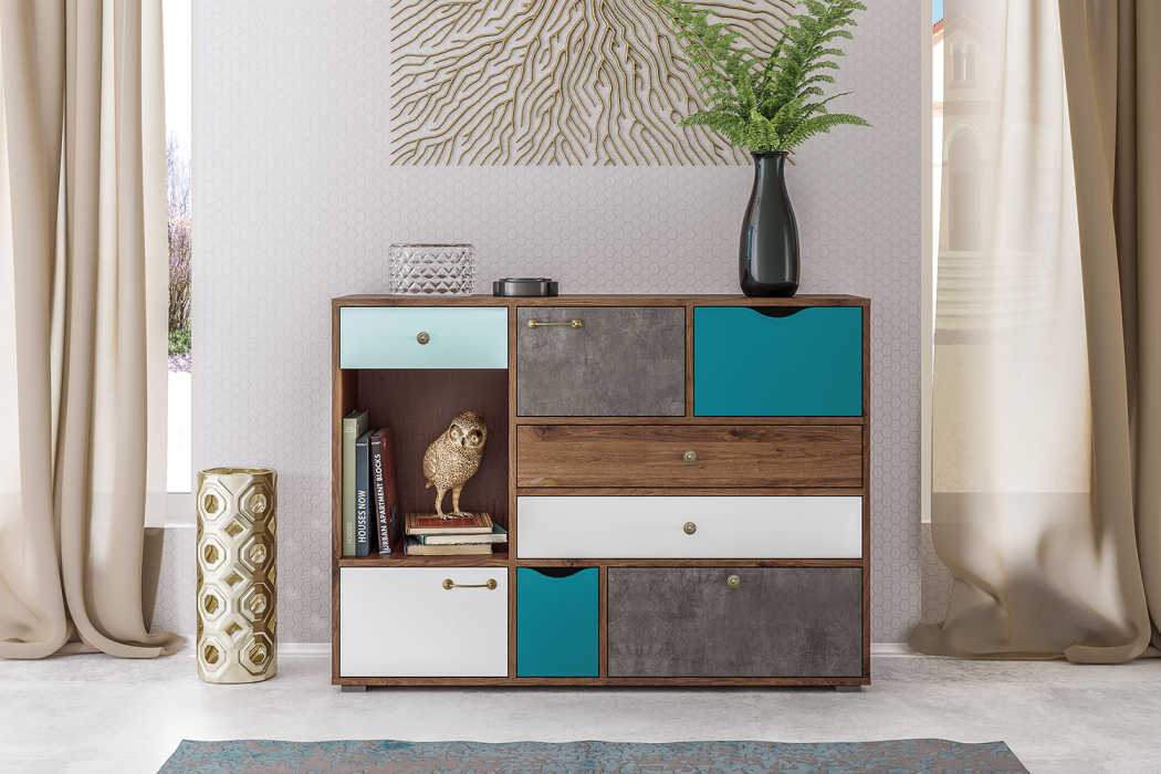 Комод Вайс 10.104 — креативный подход к системе хранения. Эксклюзивный комод Вайс 10.104 необычен всем — стильным калейдоскопом цветов, оригинальным дизайном и комбинацией элементов. Конструкция комода Вайс 10.104 включает два закрытых распашной дверкой отделения, открытую нишу и шесть выдвижных ящиков. Удобное расположение составляющих комод деталей, их различная форма и вместимость, помогают организовать идеальный порядок хранения. Пропорции комода Вайс 10.104 расчитаны для помещения любого размера - высокий, но узкий (всего 40 см.) комод — ещё и практичная подставка. В гостиной и детской — комод заменит тумбу под телевизор, в спальне и прихожей — крышка комода послужит отличным подзеркальником. Интересный микс цветов, занятная форма ручек эстетично украшают комод Вайс 10.104, дают ему шансы занять достойное место в интерьере. Корпус и фасады комода Вайс 10.104 выполнены из экологически чистой ламинированной ДСП 16 и 22 мм., торцы окромлены ПХВ плёнкой. Распашные двери комода на четырёхшарнирных петлях без доводчиков, выдвижные ящики - фолдинги на шариковых направляющих. Комод Вайс 10.104 поставляется в разобранном виде, с комплектом фурнитуры, упакованный в 4-х слойный гофрокартон. Сертификация комода Вайс 10.104 на соответствие требованиям ГОСТ и санитарно-эпидемиологическим нормам подтверждена документально.