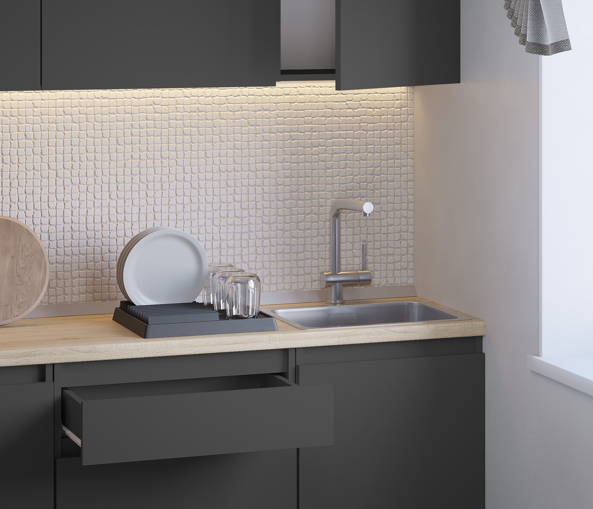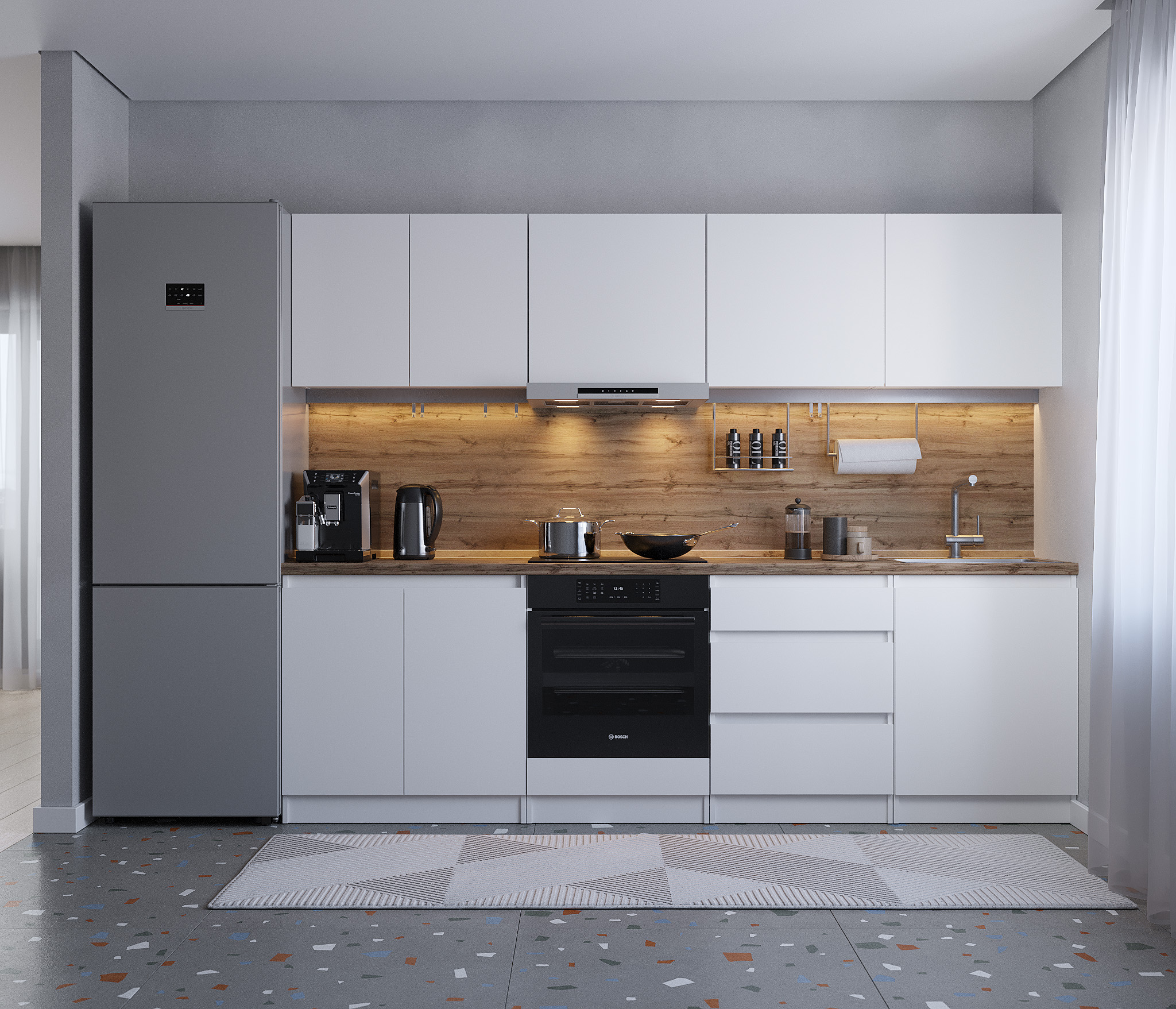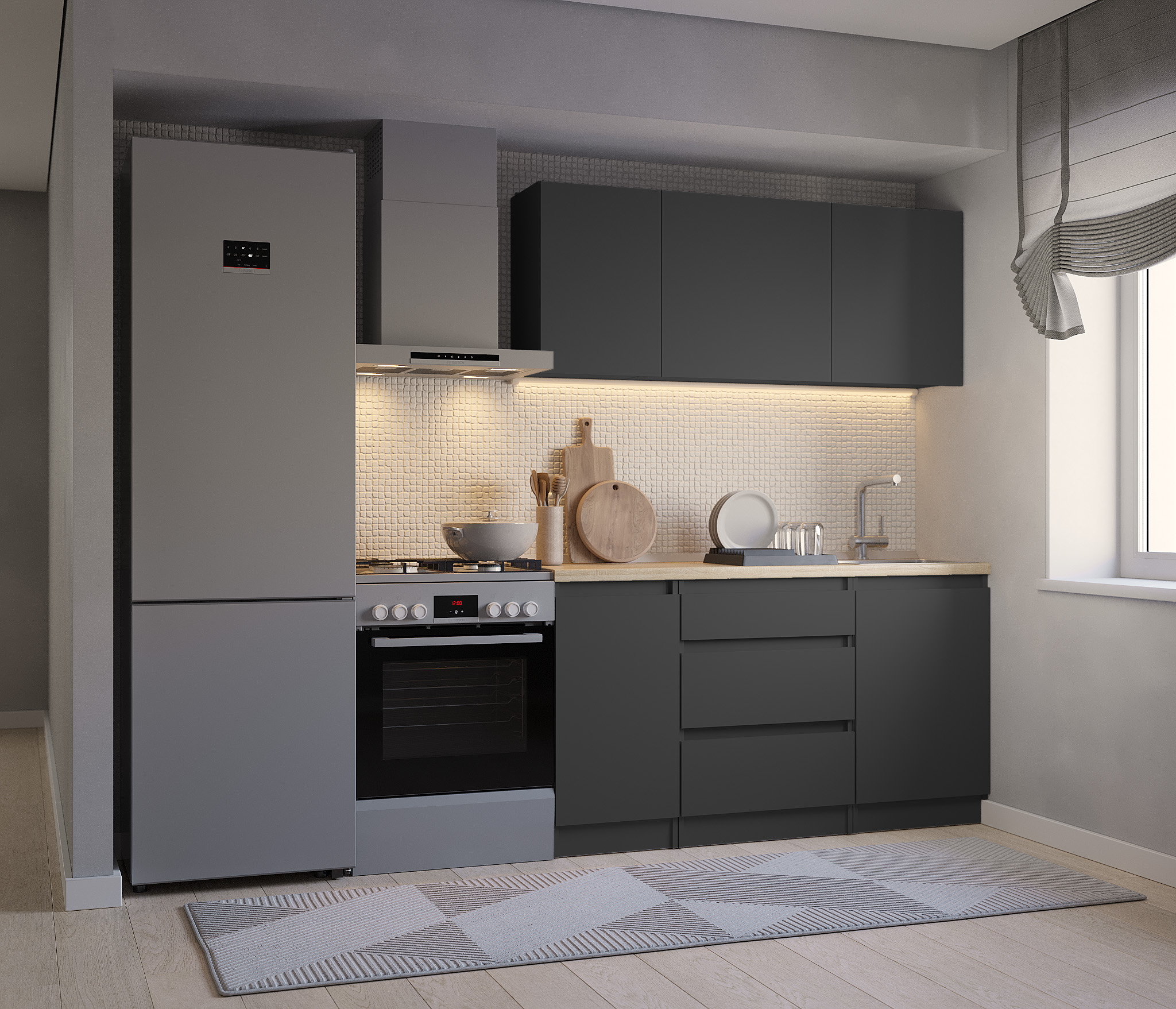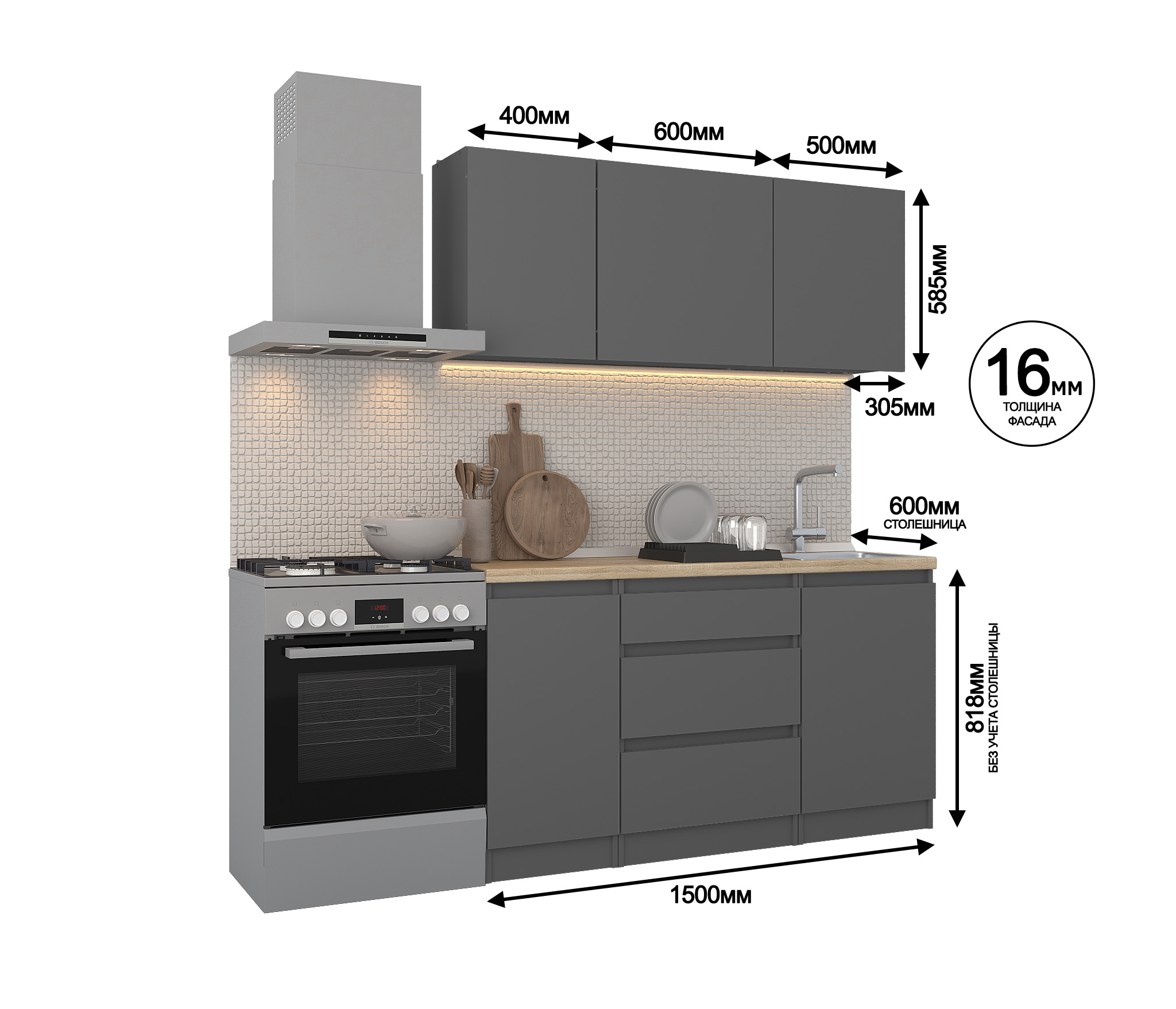 Обратите внимание, что столешница, стеновая панель, мойка и смеситель не входят в комплектацию кухни Леон и приобретаются отдельно. Это позволяет вам выбрать идеальные аксессуары и элементы для создания индивидуального дизайна вашей кухни.