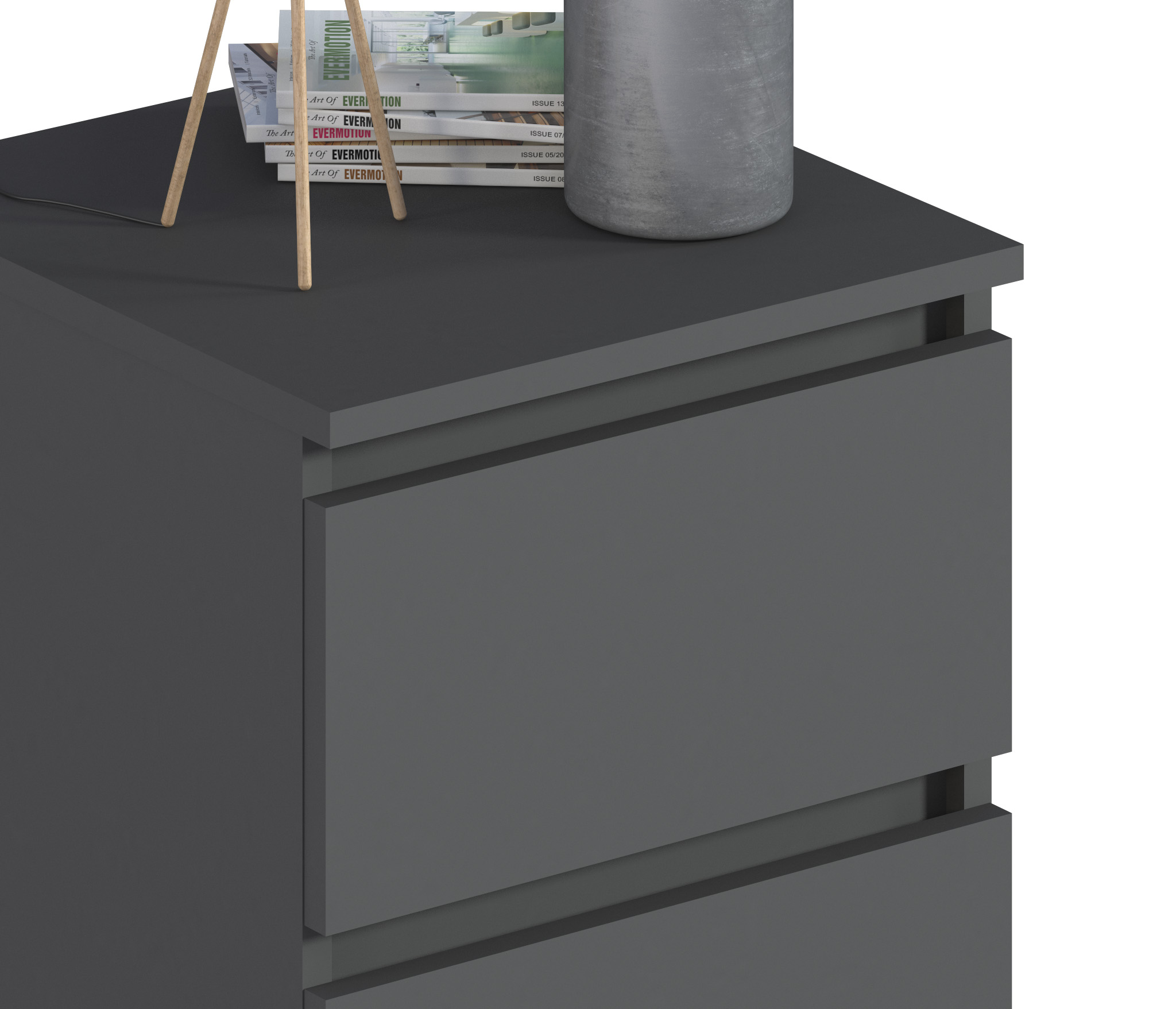 Габаритные размеры тумбы довольно компактны - ширина 39 см, высота 53 см, глубина 39 см. Под столешницей расположены два ящика, оснащенных прочными выдвижными механизмами. Тумба идеально подойдет для оформления вашей спальни или детской в современном стиле. Тумба выполнена из прочного современного КДСП.
