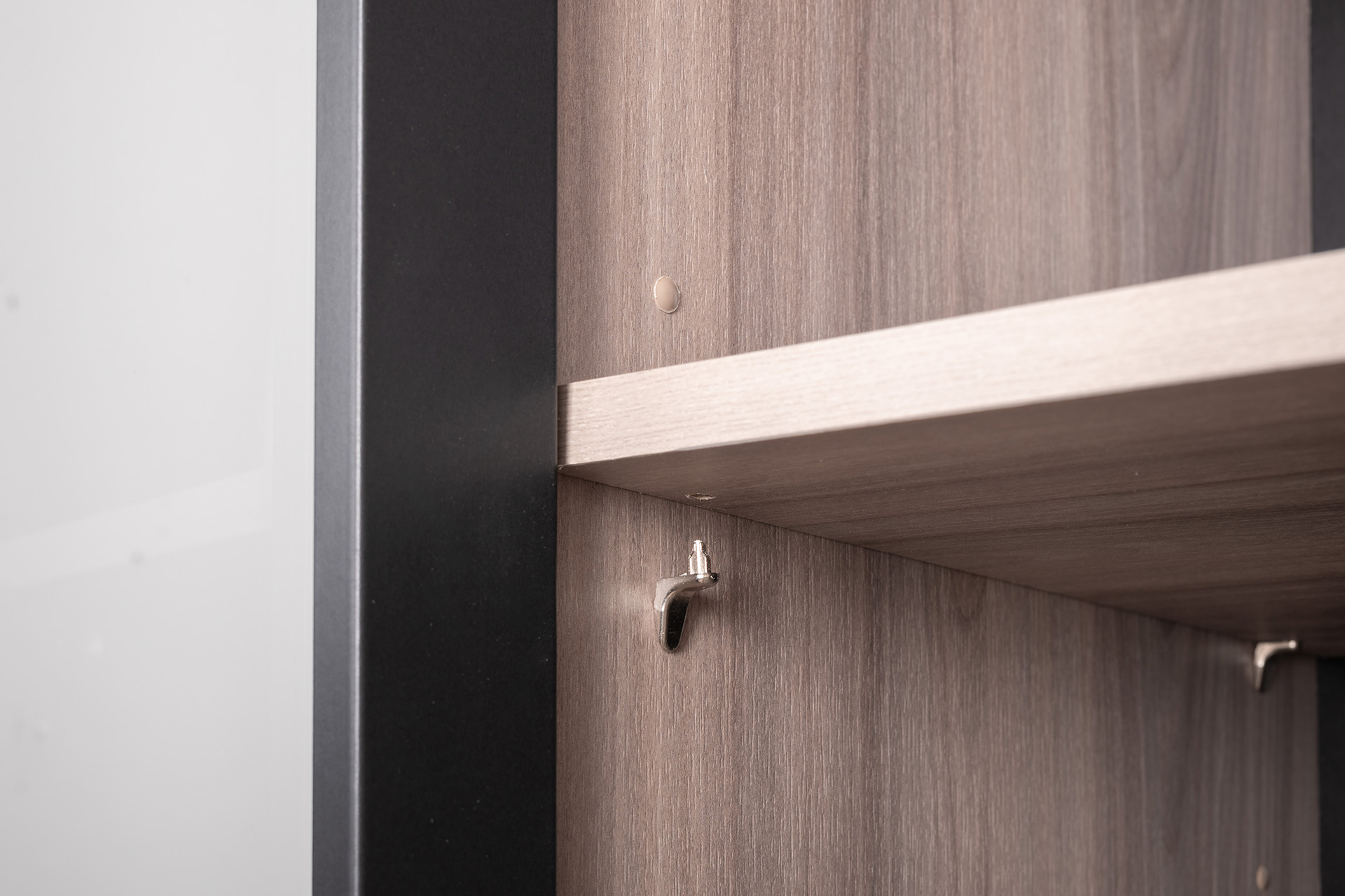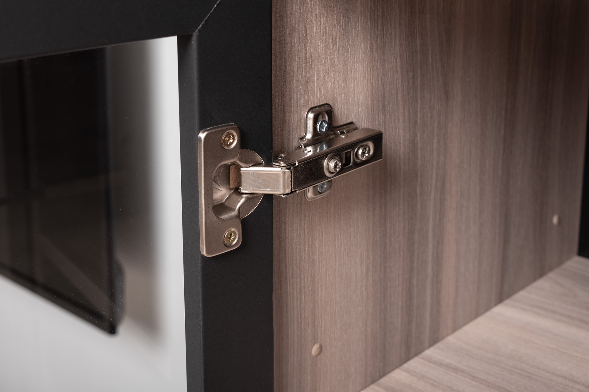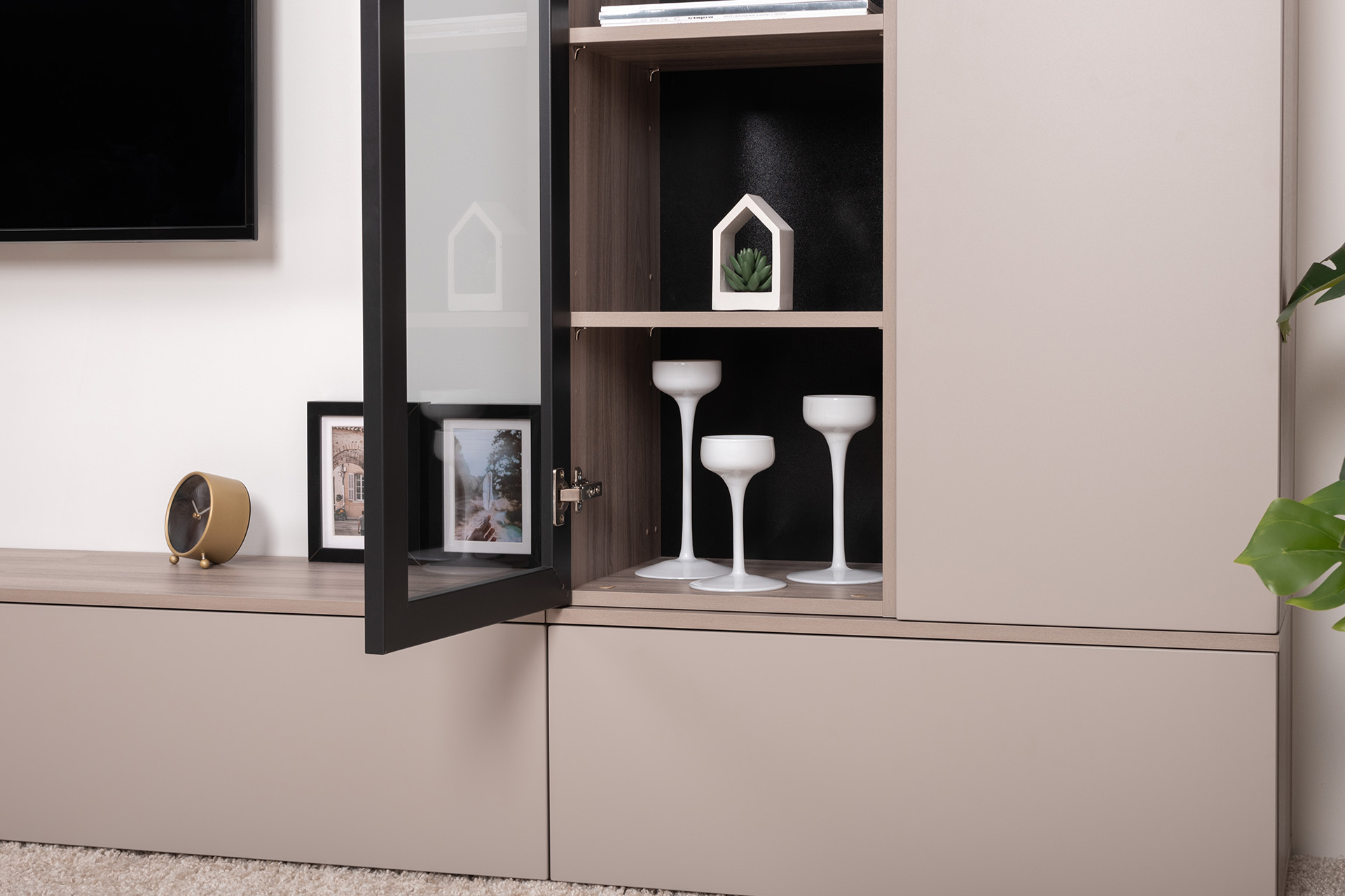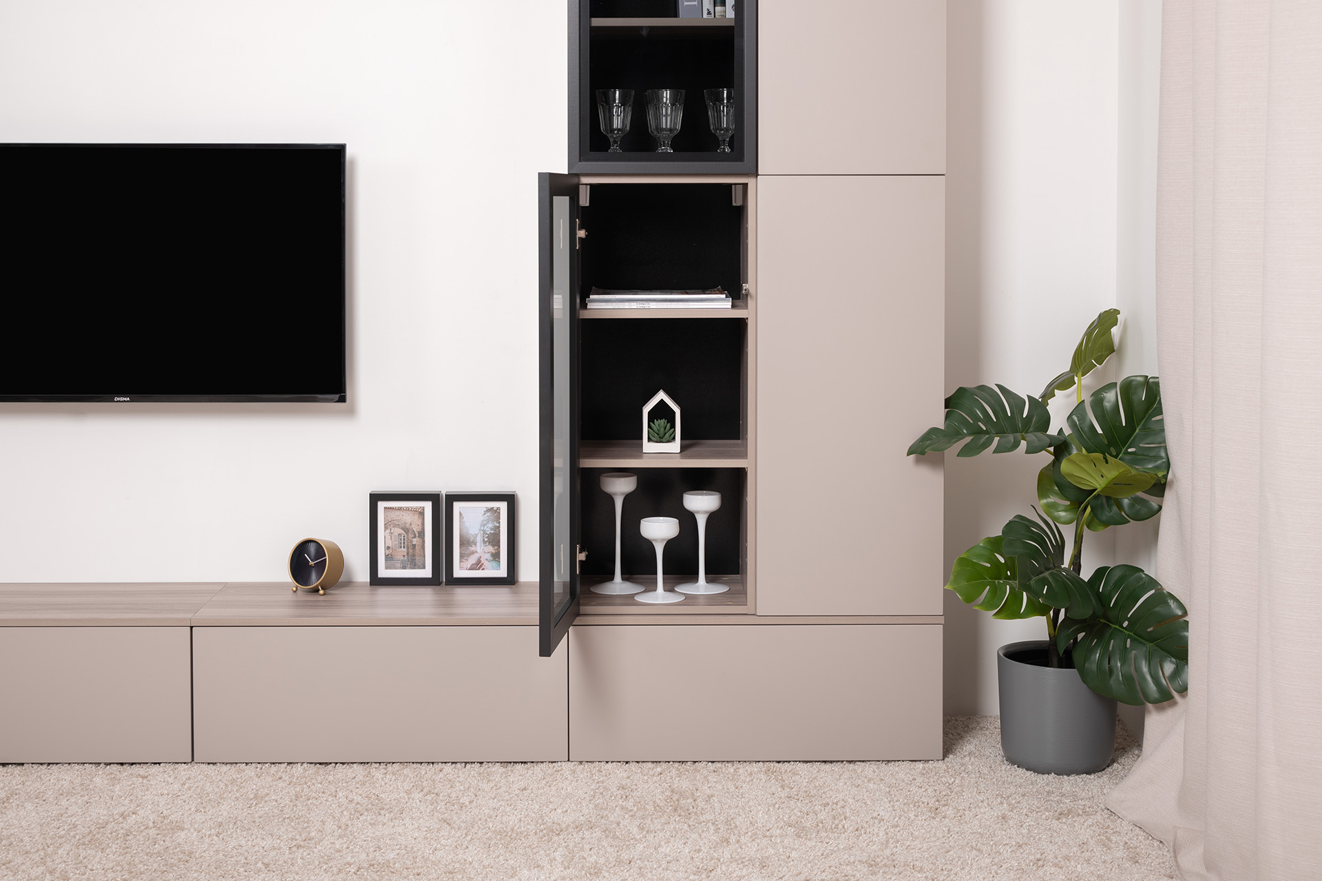Разнообразие модулей и возможность их напольной и настенной установки позволит создать гостиную оптимальной конфигурации. Распашные фасады с механизмом push-to-open, направляющие скрытого монтажа в ящиках, петли с доводчиками, регулируемые опоры, крепеж в комплекте – комфорт продуман до мелочей.