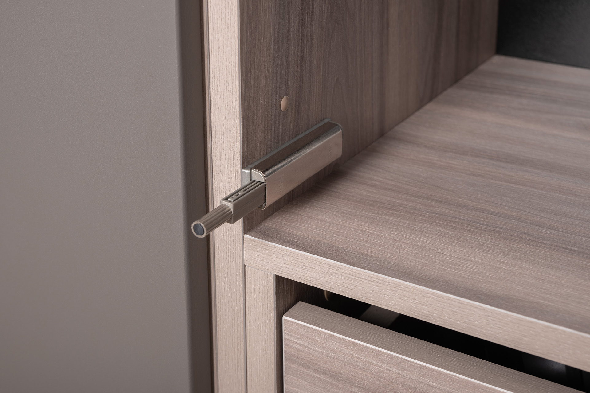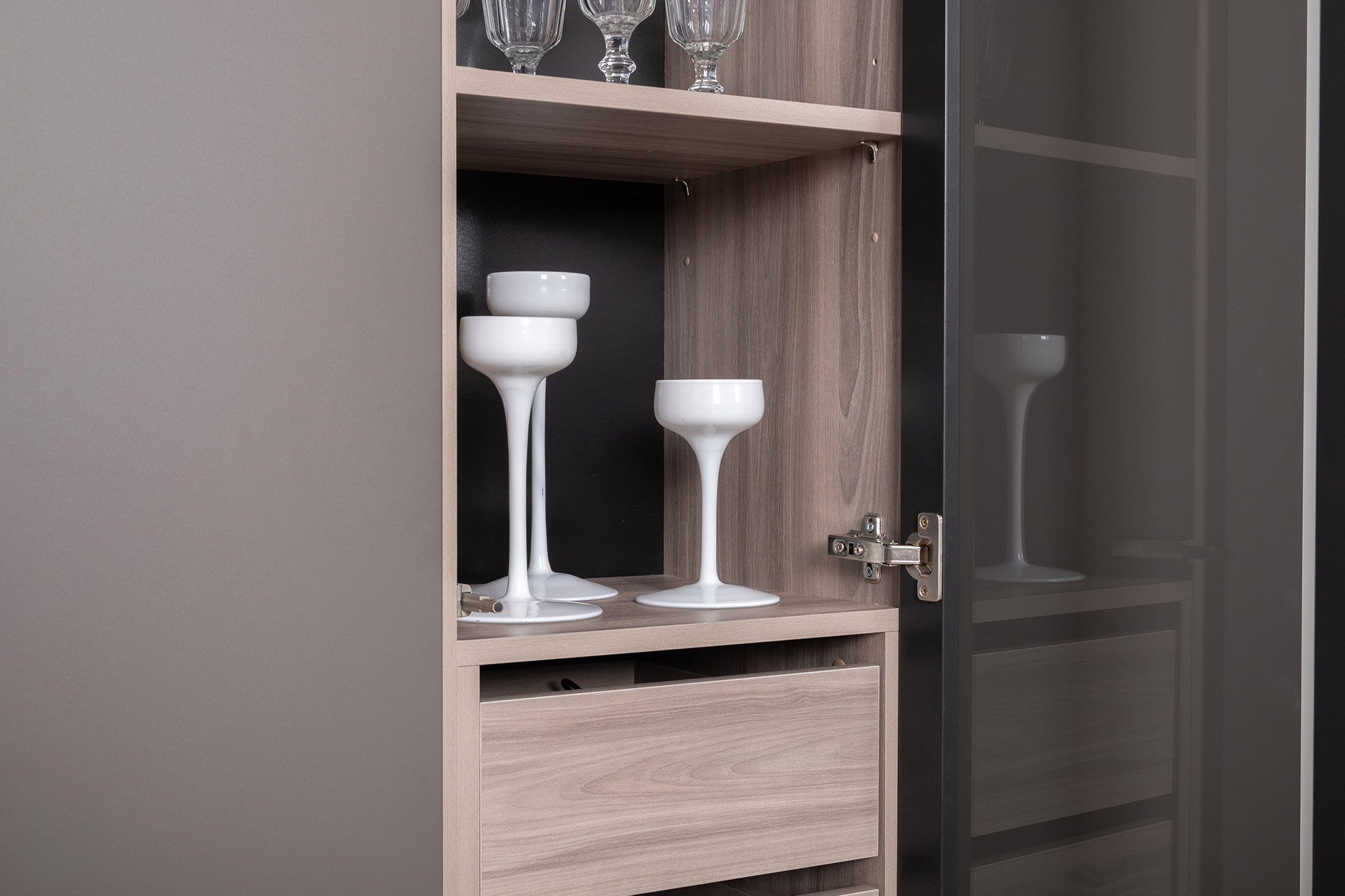 Разнообразие модулей и возможность их напольной и настенной установки позволит создать гостиную оптимальной конфигурации. Распашные фасады с механизмом push-to-open, направляющие скрытого монтажа в ящиках, петли с доводчиками, регулируемые опоры, крепеж в комплекте – комфорт продуман до мелочей.