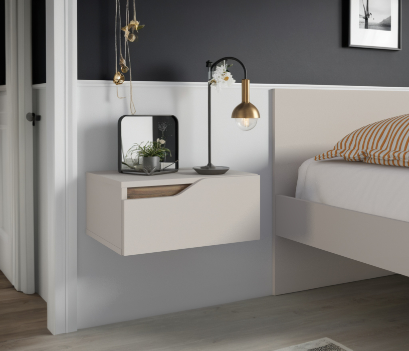 Особенностью данной модели являются плавные вырезы в фасадах, которые не только удобны для открывания, но и добавляют оригинальности. Внутри этих вырезов расположены вставки цвета Дуб вотан, что создает контраст и подчеркивает эстетику мебели.
