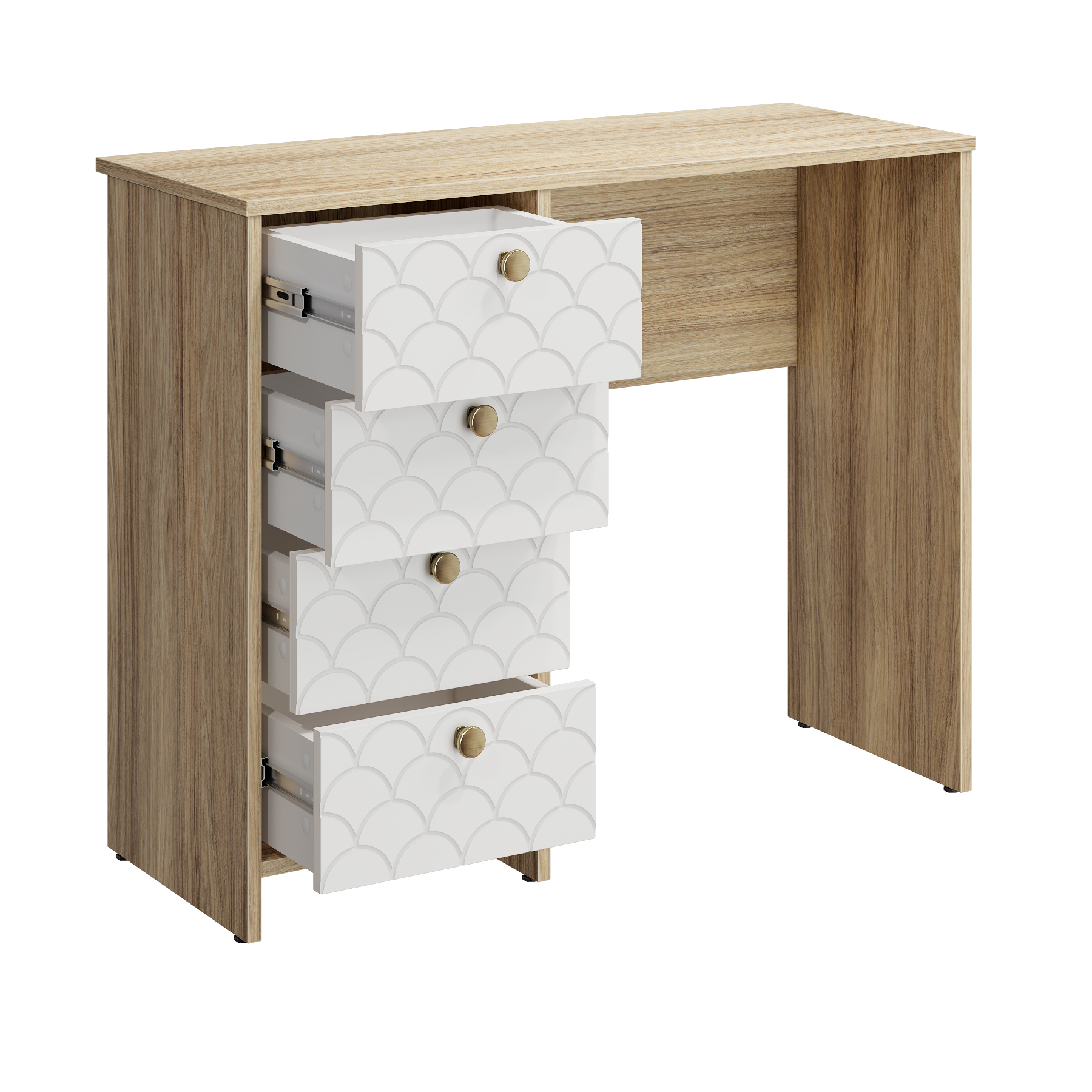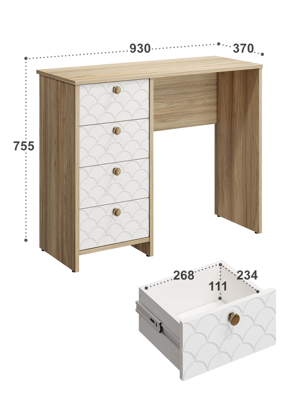 Размеры комплекта (ш/в/г) в мм: 930х760х370 Материал корпуса/фасада: ЛДСП 16мм, МДФ 16мм Стол Велламо ВО-10 прекрасно впишется в интерьер уютной и комфортной комнаты. Изделие поможет создать достаточно удобное место для наведения красоты или рабочей зоны. Широкая столешница позволит разместить под рукой все необходимые предметы. Четыре выдвижных ящика созданы для бережного хранения косметики, аксессуаров и украшений и других предметов. Толщина столешницы ЛДСП 16 мм, дно ящика двп 3 мм. Регулируемые опоры. Стол может быть собран "ЛЕВЫМ" или "ПРАВЫМ". Фурнитура: телескопические бесшумные направляющие полного выдвижения без доводчиков, ручки металл. Доставка и сборка: мебель поставляется в разобранном виде, в надежной упаковке, с подробной инструкцией по сборке. Сборка осуществляется самостоятельно или с привлечением специалистов.