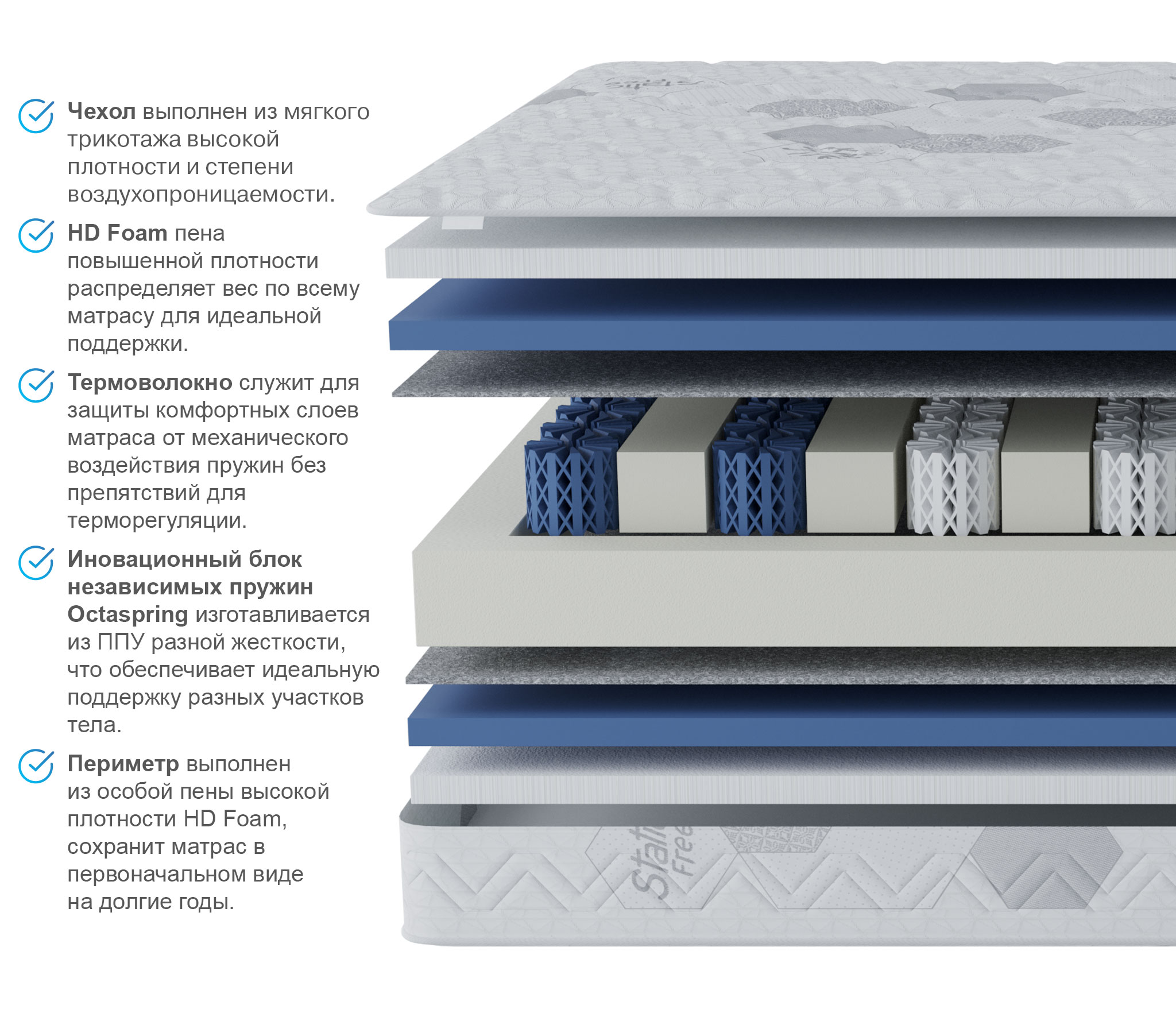 Пена Sky Cell дарит упругую поддержку и комфортную высокую жесткость. Она прекрасно распределяет нагрузку и обеспечивает качественную опору каждой части тела человека. Ребра жесткости из высокоплотной пены по всей площади матраса обеспечивают уникальную упругость, дарящую здоровый сон и заряд бодрости на весь день. Повышенная воздухопроницаемость пружин Octaspring обеспечивает комфортную свежесть спального места на протяжении всей ночи.