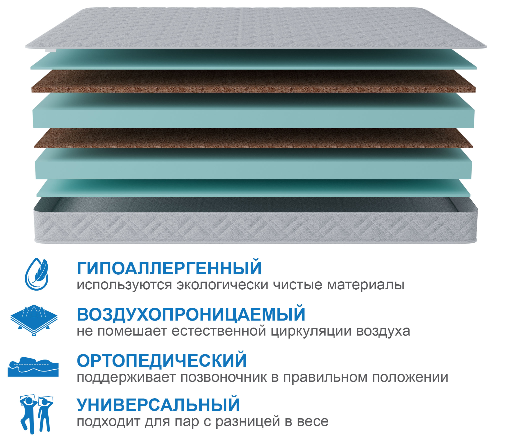 Матрас состоит из комбинации высокопрочных пен и кокосовых матов, что создает уникальное сочетание комфорта и надежности. Данная модель понравится тем, кто предпочитает жесткие матрасы, но при этом одна из сторон более упругая, а другая более жесткая. Ткань чехла матраса не поддерживает горение, что обеспечит дополнительную безопасность. Это отличная классическая модель беспружинного матраса, отвечающая всем современным требованиям. Материалы матраса обладают превосходной воздухопроницаемостью, что обеспечивает высокую степень термального комфорта как в зимние, так и в летнее время.При выборе матраса следует помнить о том, что любой матрас не отвечает за правильность положения головы и шеи, их здоровье зависит от правильно подобранной ортопедической подушки. Для увеличения срока службы матраса рекомендуется его использование с защитным чехлом AquaStop.