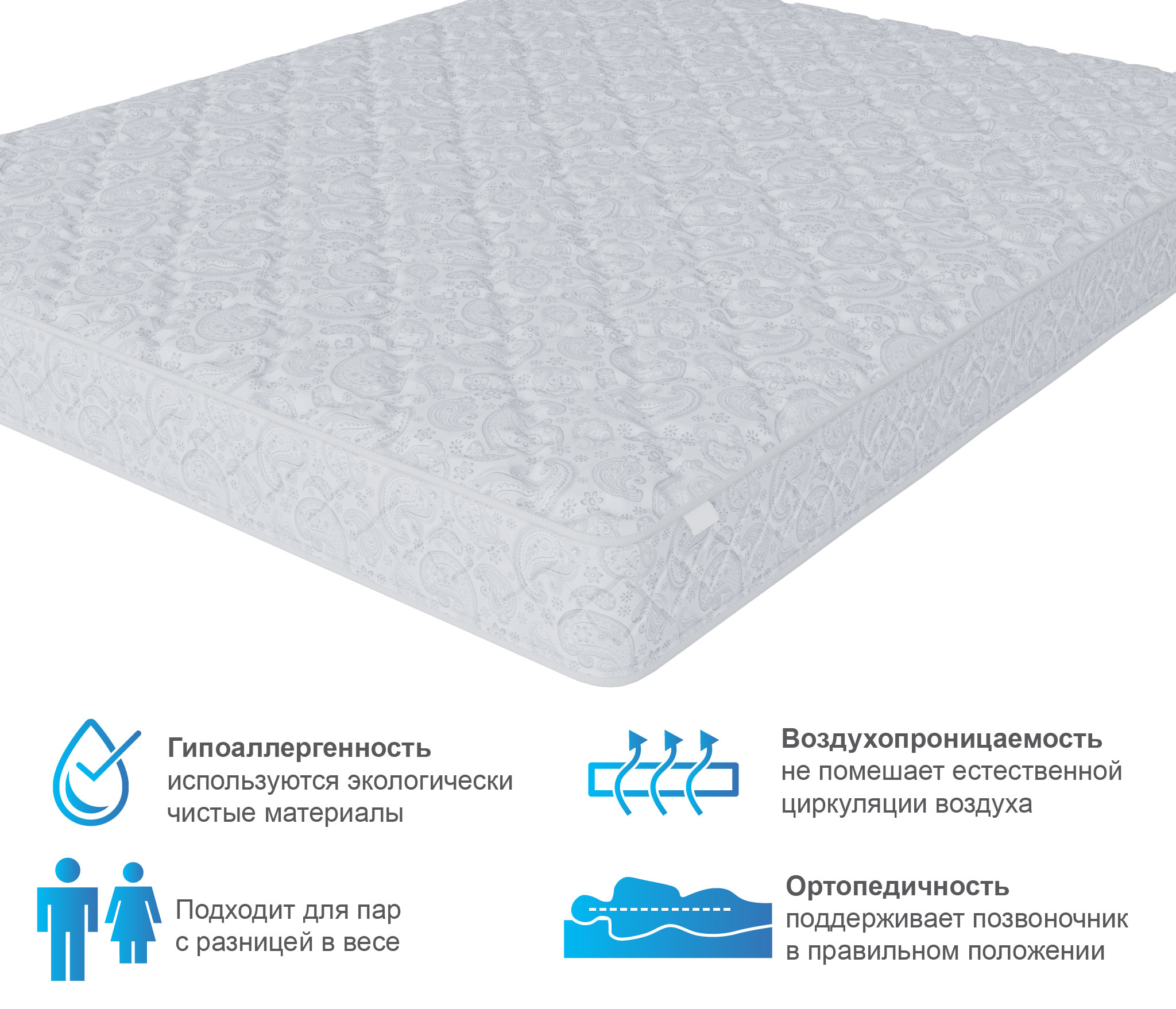отличный выбор для людей с весом выше среднего. Это жесткий беспружинный матрас, в состав которого входят как искусственные, так и натуральные материалы. В качестве наполнителя матраса используются 5 слоев латексированной кокосовой койры. Это натуральный материал на основе кокосового волокна, пропитанного натуральным латексом, а также листы высокоэластичной пены. Оба материала жесткие, упругие и очень долговечные. При этом матрас подходит для кроватей с подъемным механизмом. Это идеальный матрас для людей желающих поправить здоровье, улучшить сон и уменьшить боли в суставах. При выборе матраса следует помнить о том, что любой матрас не отвечает за правильность положения головы и шеи, их здоровье зависит от правильно подобранной ортопедической подушки. Для увеличения срока службы матраса рекомендуется его использование с защитным чехлом AquaStop.