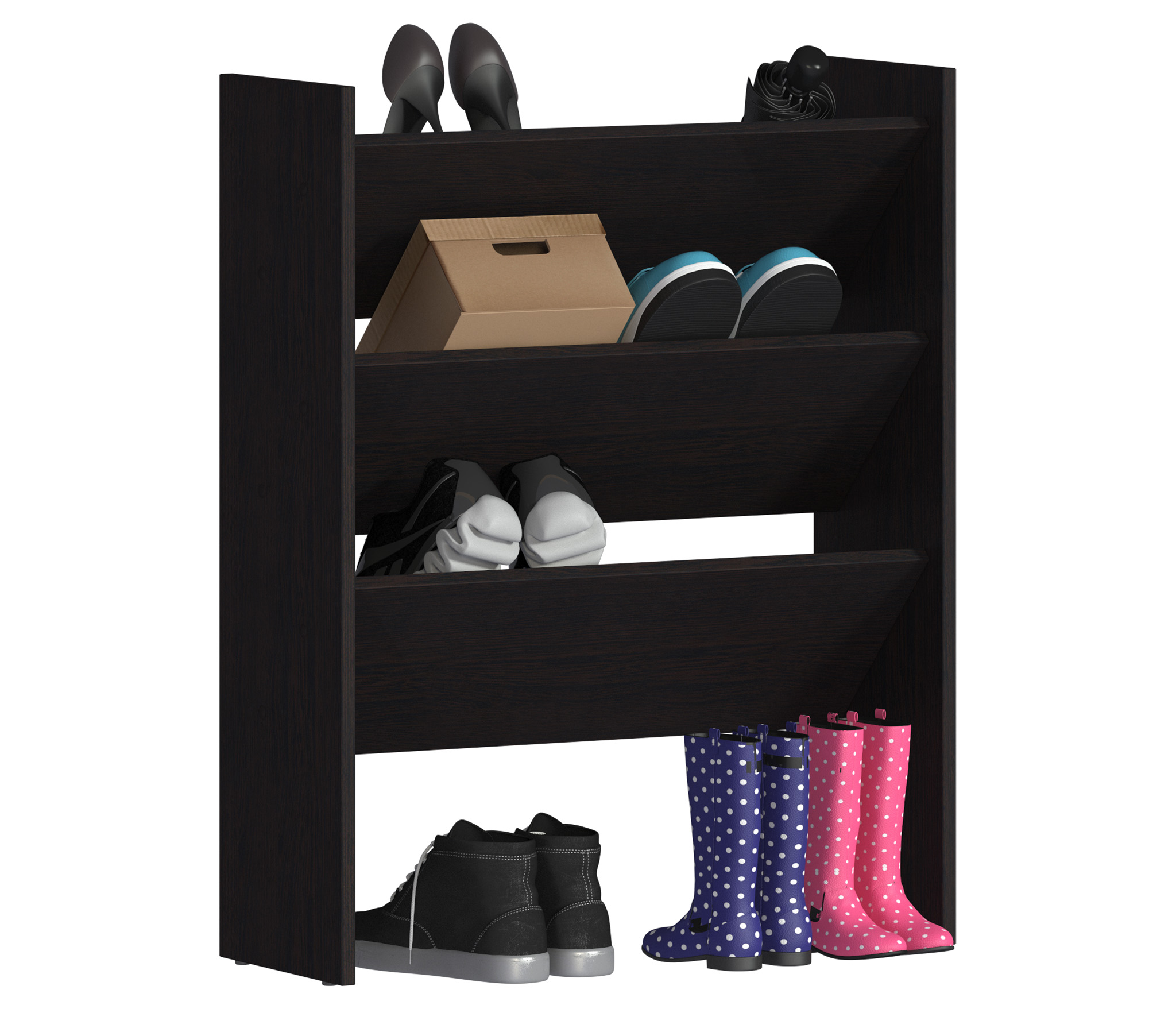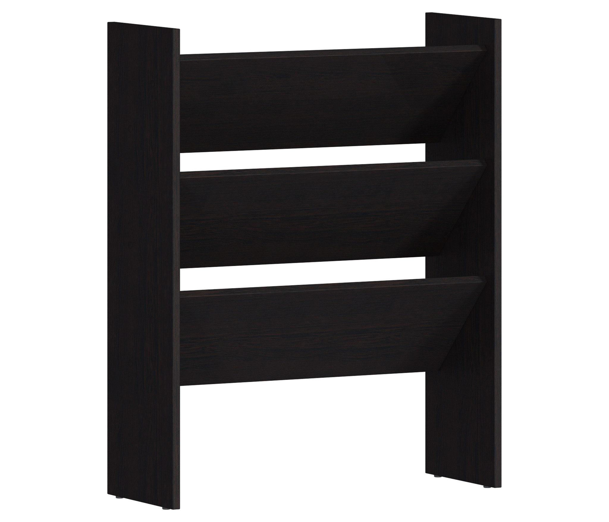 Обувница Дельта СБ-2130 выполнена в минималистичном дизайне, оснащена тремя полками и впишется в интерьер небольшой прихожей. ¶Габаритные размеры – ширина 71 см, высота 90 см и глубина 27 см. Благодаря продуманной конструкции этот функциональный предмет мебели даст возможность аккуратно хранить до 12 пар обуви. На открытых полках обувь всегда будет быстро высыхать и проветриваться. ¶Обувница выполнена в цвете «Венге» из экологичного современного КДСП.