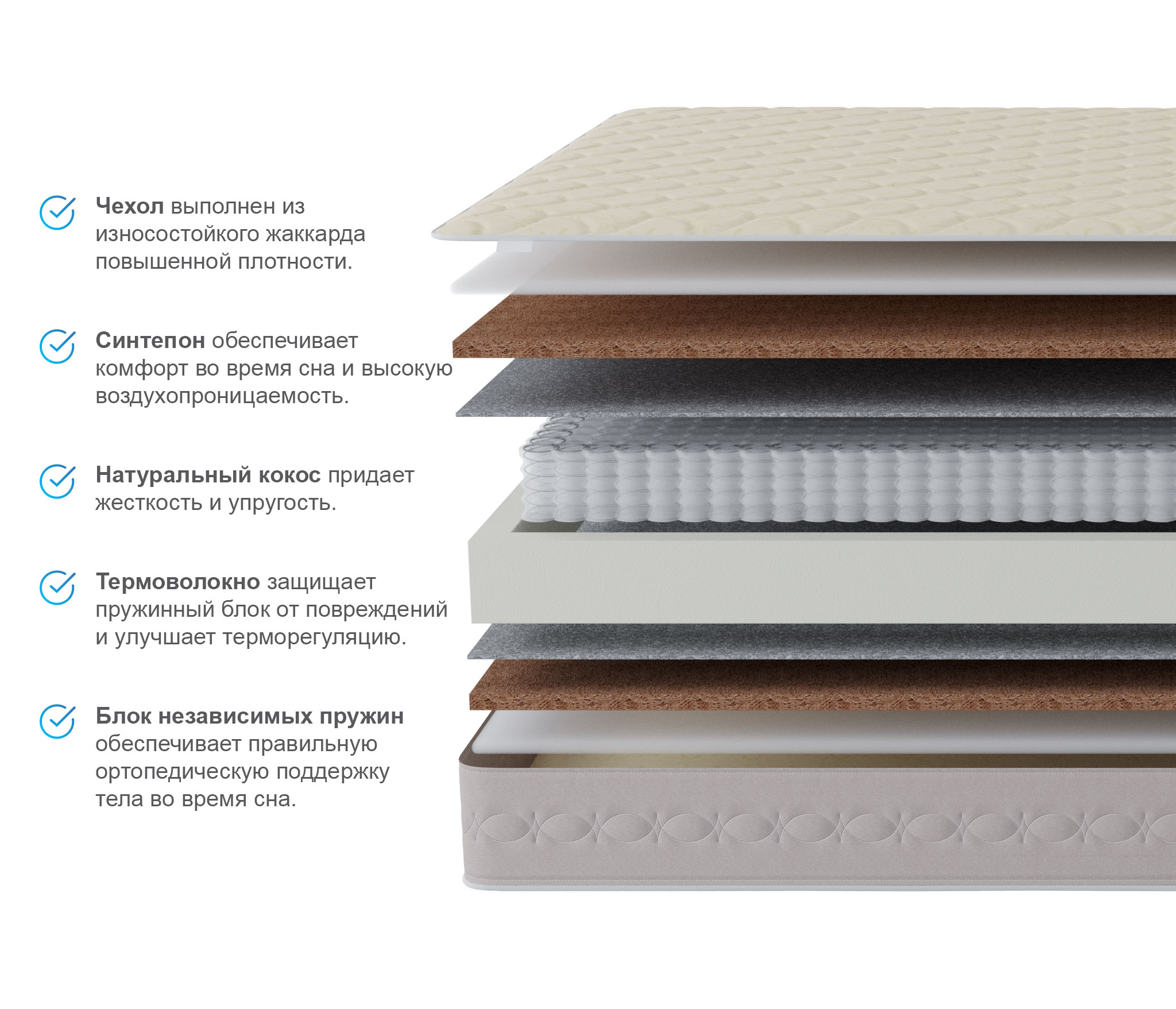 Чтобы матрас из каталога нашего магазина надолго оставался жестким и очень прочным, при производстве были использованы листы латексированного кокоса. Защита комфортных слоев от преждевременного истирания обеспечивается термоволокном, а сохранение правильной геометрии - усилением периметра.