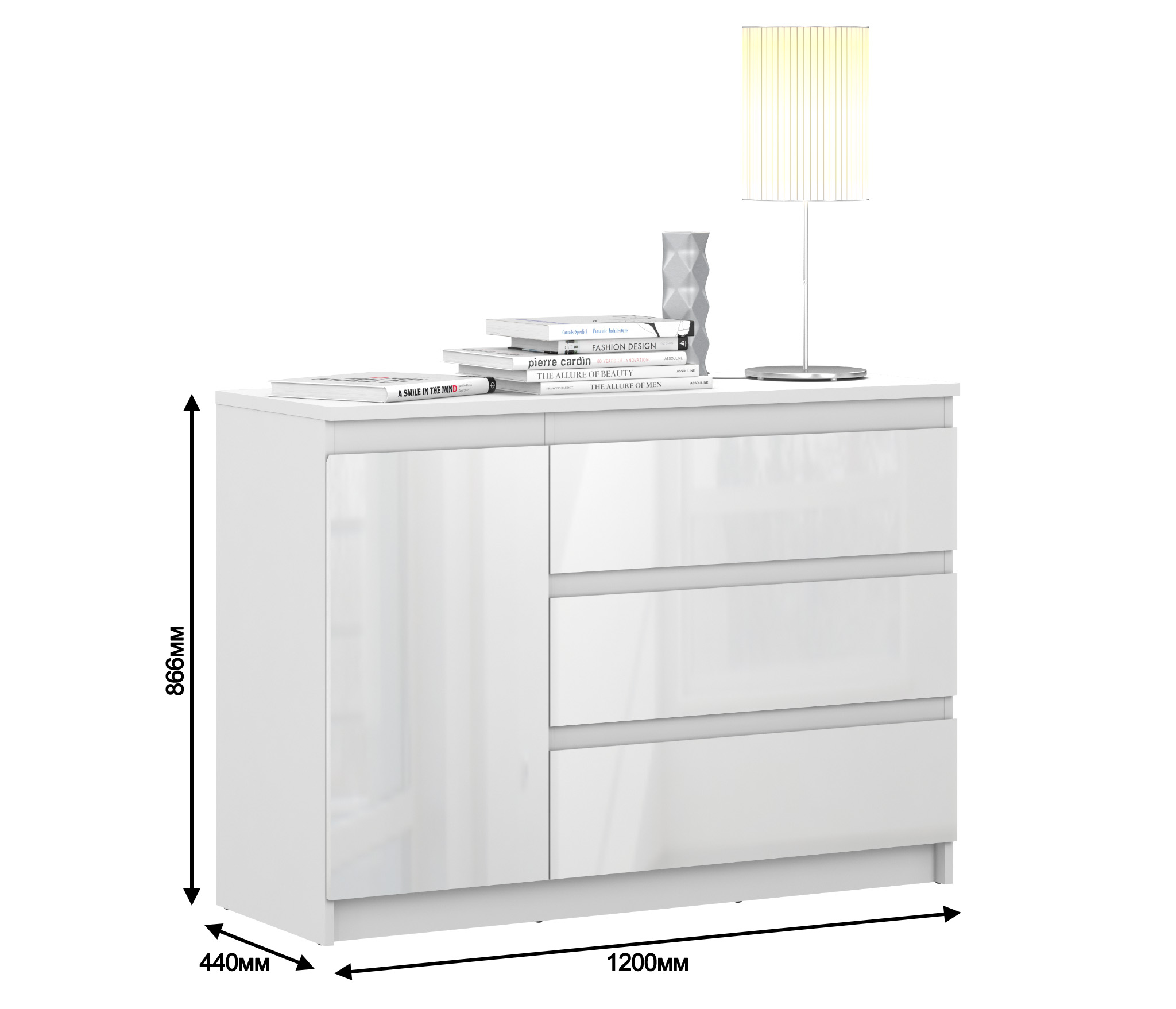 Размеры комода – ширина 120 см, высота 86 см и глубина 44 см. Под одной столешницей объединены три выдвижных ящиков и тумба. Тумба оснащена двумя довольно высокими полками. Комод Медея выполнен из прочного и влагоустойчивого материала. Все выдвижные механизмы прочные и имеют солидный ресурс. Комод выполнен в лаконичном дизайне, белое глянцевое покрытие фасадов позволяет смотреться этому предмету мебели стильно и не громоздко.