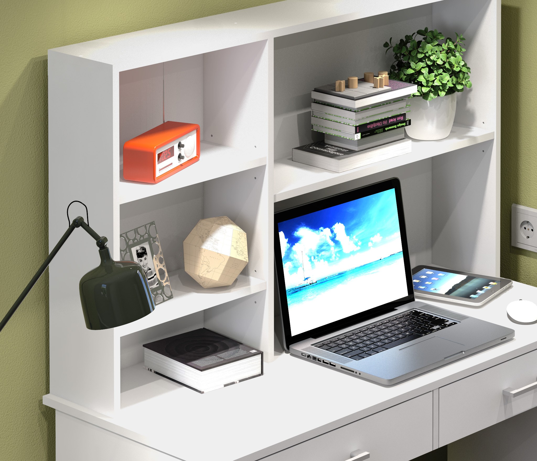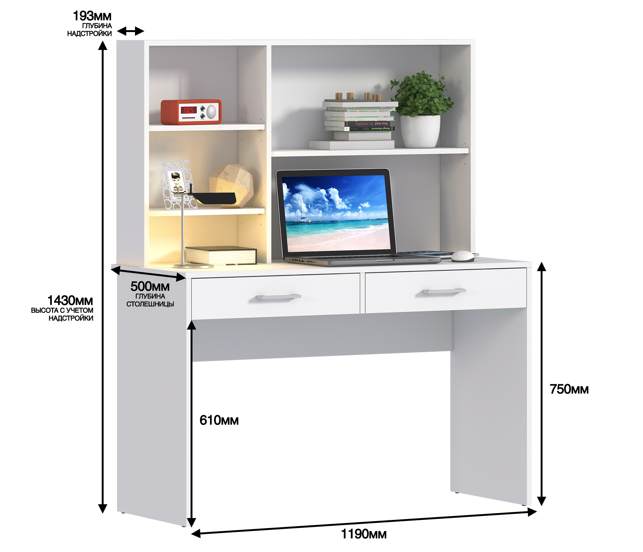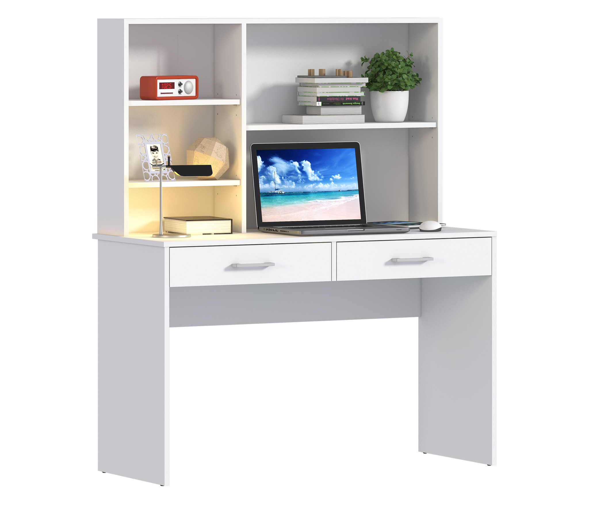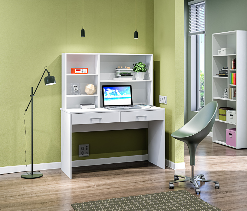 Стол Терра СБ-3213, благодаря продуманной конструкции и стильному классическому дизайну, может быть полноценным рабочим местом с возможностью размещения ноутбука и периферийной аппаратуры в детской комнате или комнате студента. Габаритные размеры – ширина 115 см, высота 143 см и глубина 50 см. Под рабочей поверхностью расположены два выдвижных ящика. Над столешницей находятся открытые вместительные полки, где можно хранить бумаги, документы, небольшой принтер и другие полезные вещи. Стол выполнен из экологичного и современного ЛДСП. Оформление отделки выполнено в белом цвете. Стильный дизайн, прочные выдвижные механизмы, качественный материал отделки дают возможность стилизовать стол Терра как самостоятельный предмет мебели, так и в составе одноименного гарнитура.