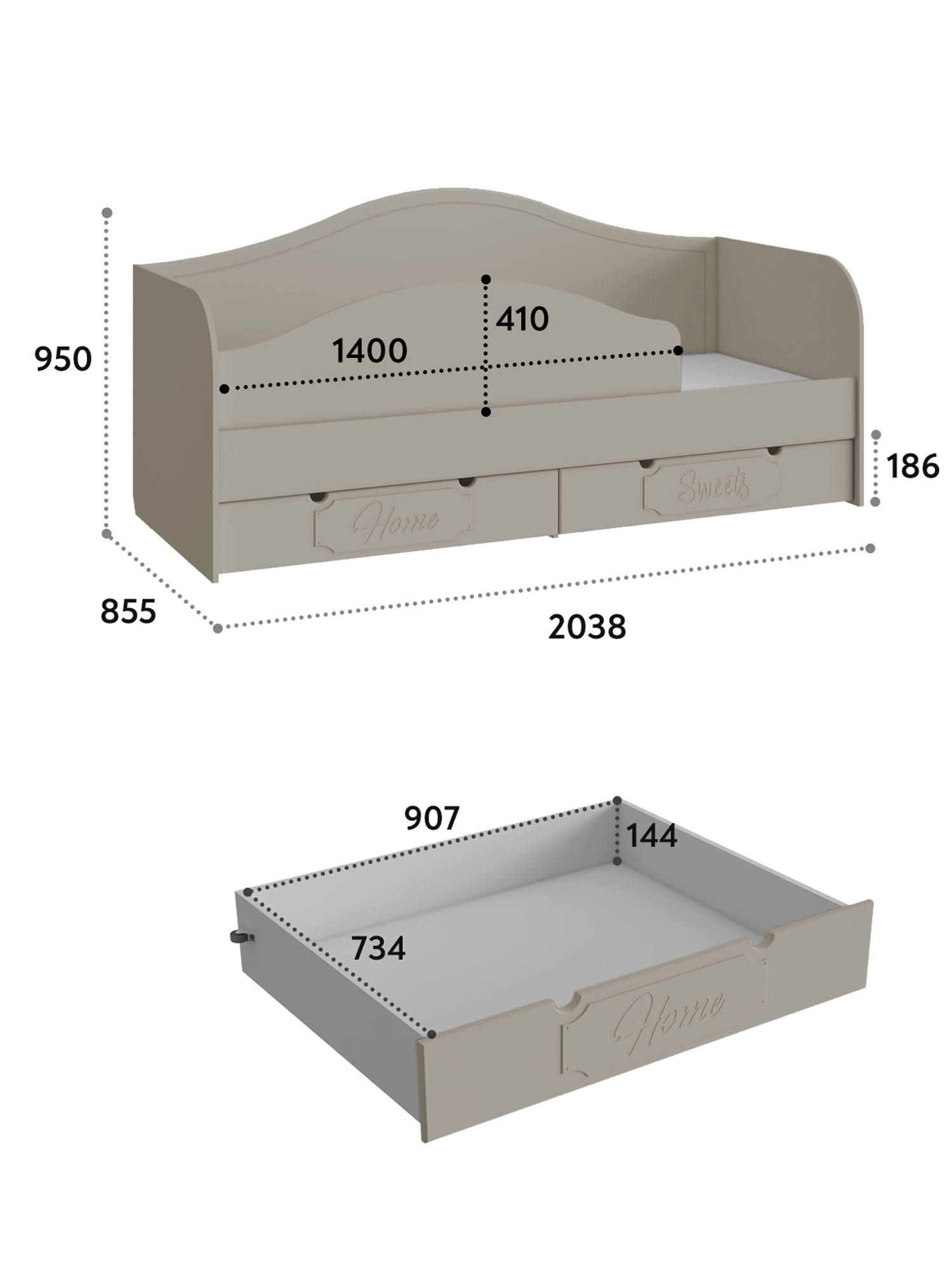 Материал корпуса/фасада: ЛДСП/МДФ. Цвет корпуса/фасада: белое дерево. Размеры модуля (ш/г/в) в мм: 2038х855х950. Кровать идет в комплекте с бортиком. Защитная боковая панель (бортик) 410х1400 мм, крепится к любой боковой стенке. Основание кровати - фанера. Ламели не предусмотрены конструктивом. Размер ящиков в мм: 939х750х174.