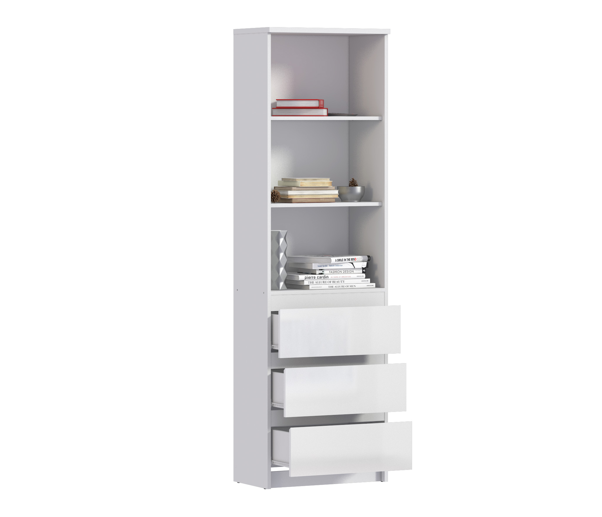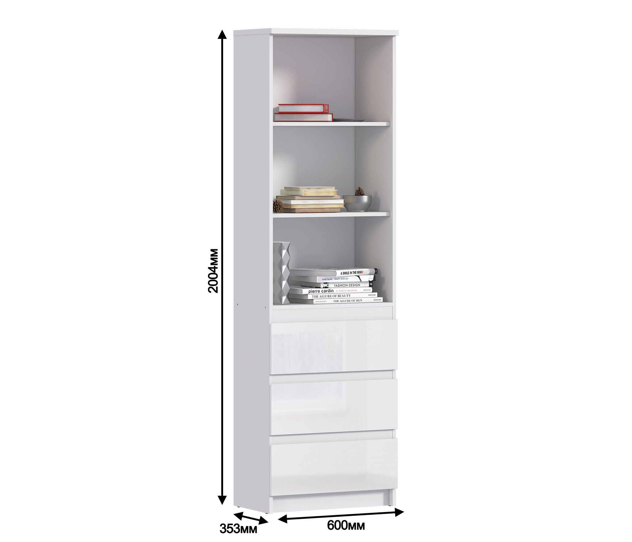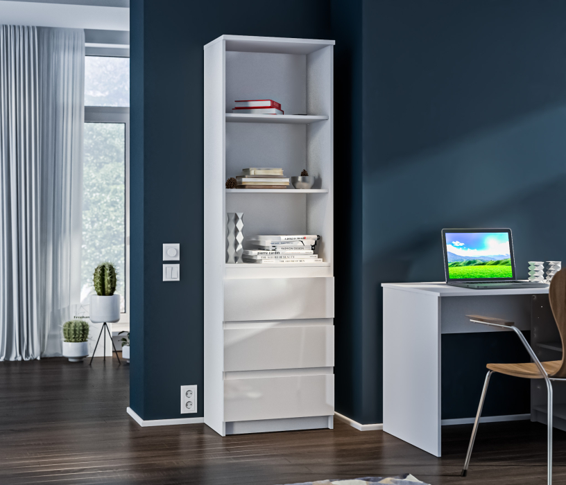 Габаритные размеры – ширина 60 см, высота 200 см и глубина 35 см. Конструктивно стеллаж состоит из трех вместительных открытых полок и расположенных под ними трех закрытых выдвижных ящиков.