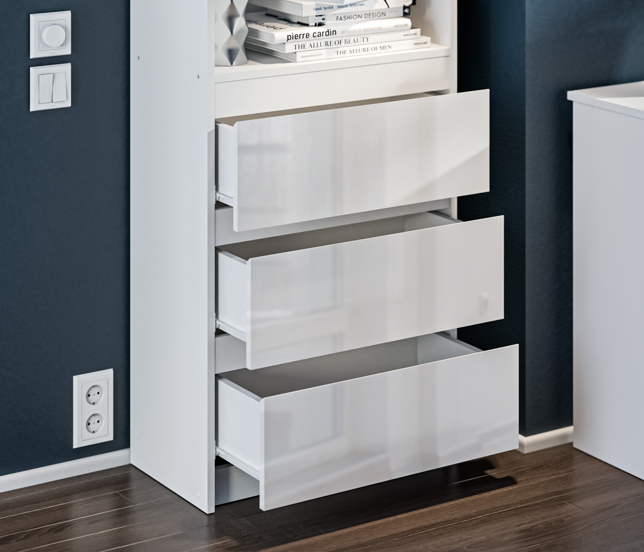 Производится стеллаж из современного материала ЛДСП. Корпус облицован декоративной пленкой белого цвета. Фасады выполнены в белом глянцевом цвете. Материал отделки устойчив к воде и бытовым чистящим средствам. Стеллаж можно стилизовать в модульную систему Медея.