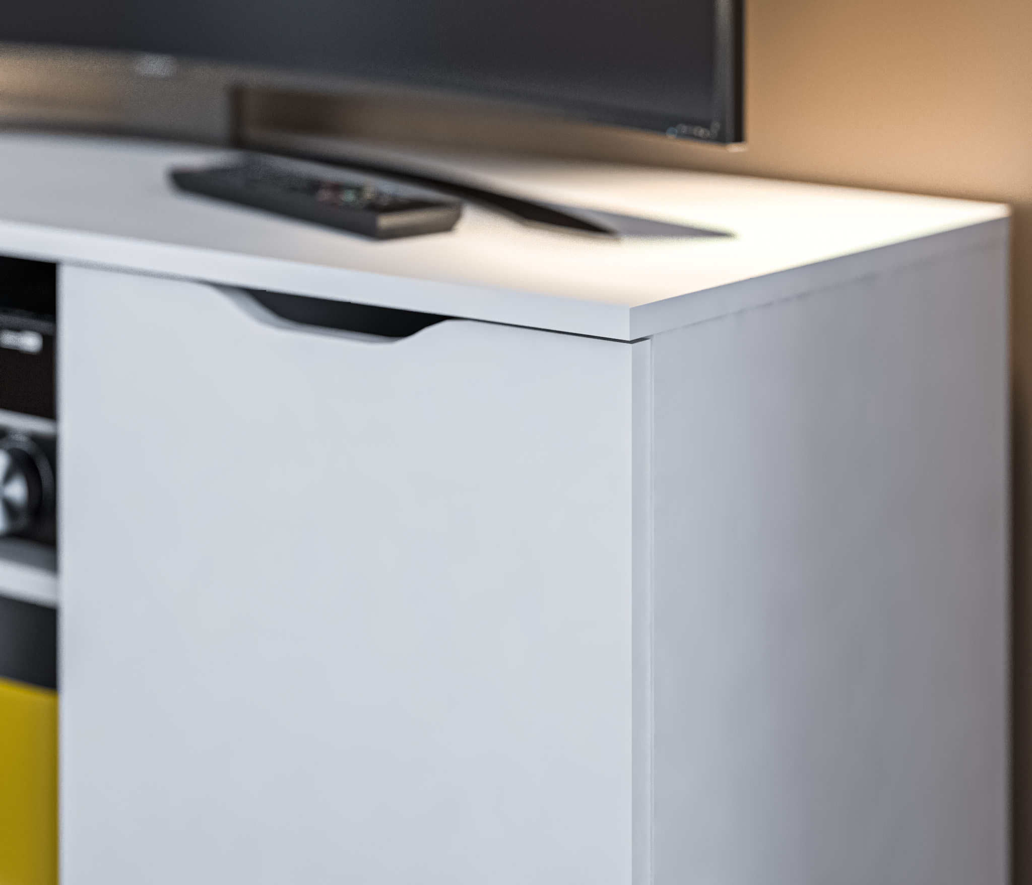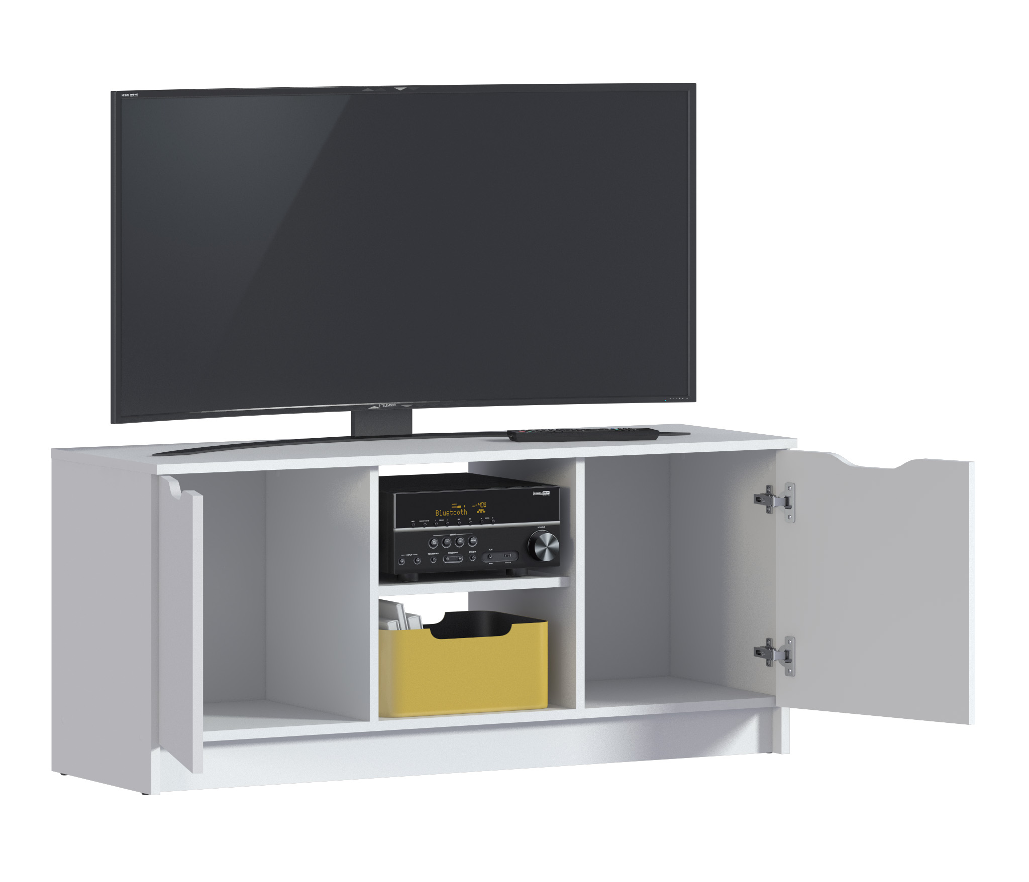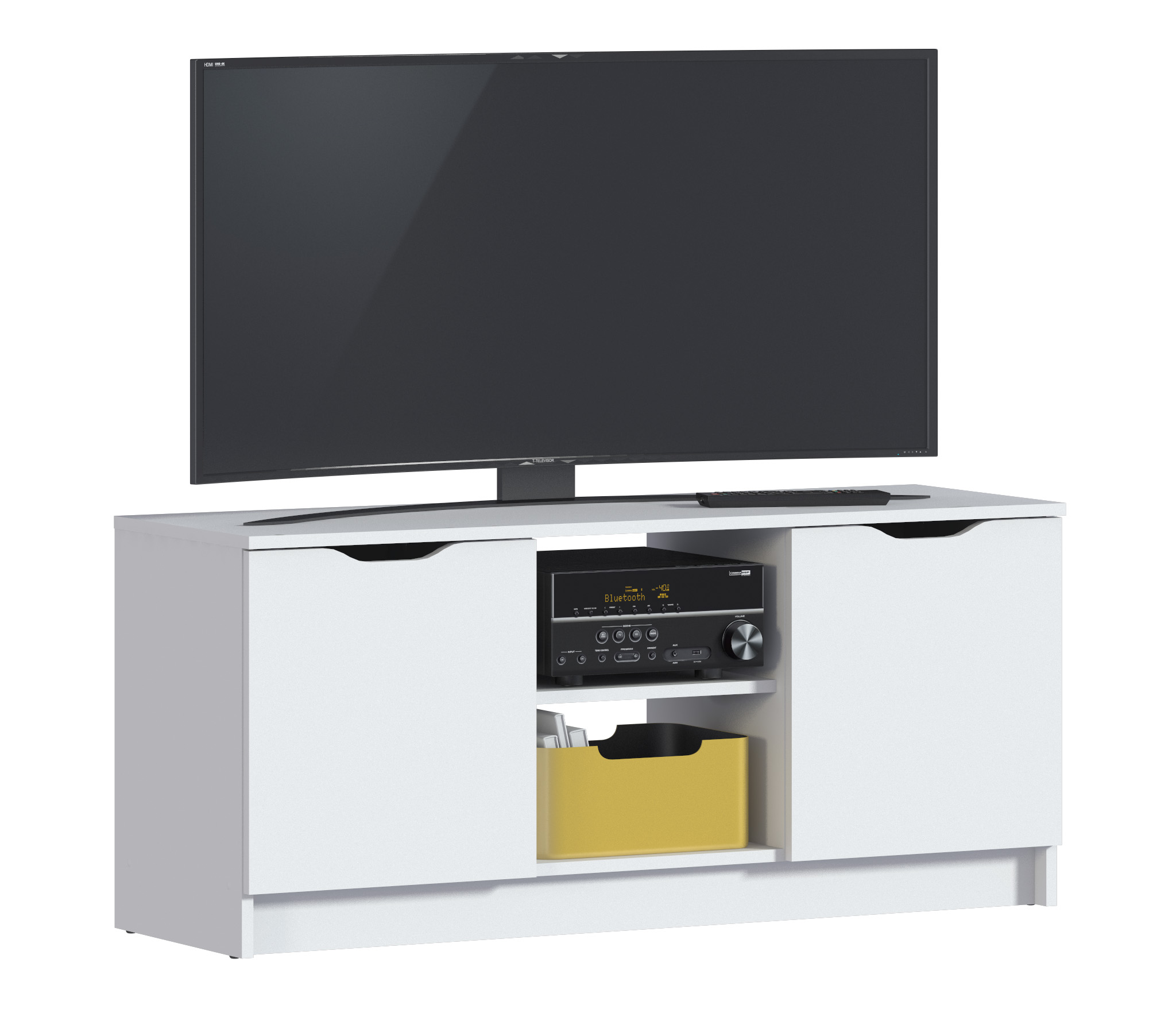Габаритные размеры – ширина 119, высота 53 см и глубина 39 см. Вес тумбы 24,42 кг, что даёт возможность передвигать её по усмотрению. Визуально тумбу можно разделить на три отделения – открытое центральное с двумя полками для аудио или видео системы и два вместительных отделения с дверцами. Тумба выполнена в минималистичном дизайне из прочного современного материала ЛДСП.