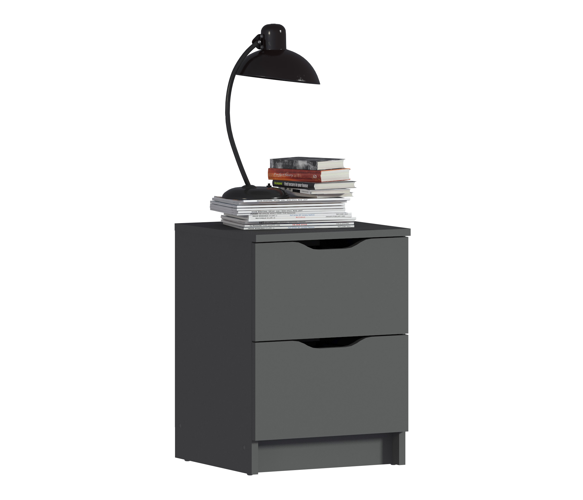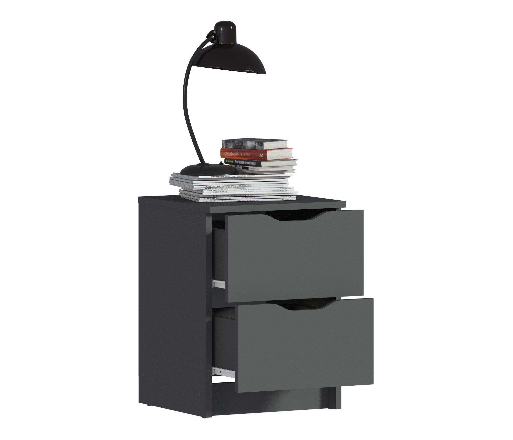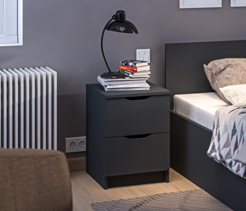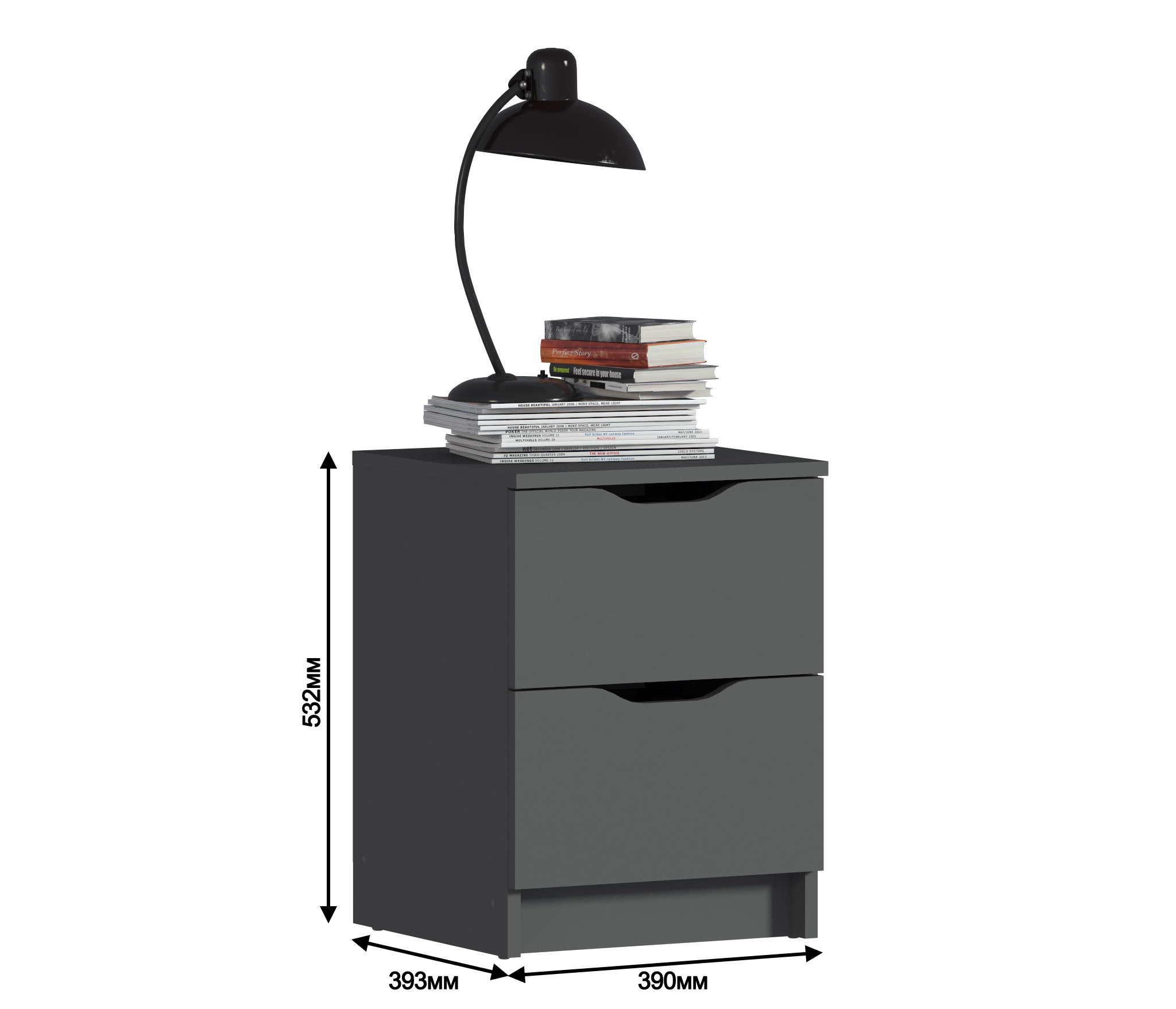 При компактных габаритных размерах – ширина 39 см, высота 53 см и глубина 39 см, тумба довольно вместительная. Под столешницей расположены два выдвижных ящика с прорезными ручками, где можно хранить вещи.