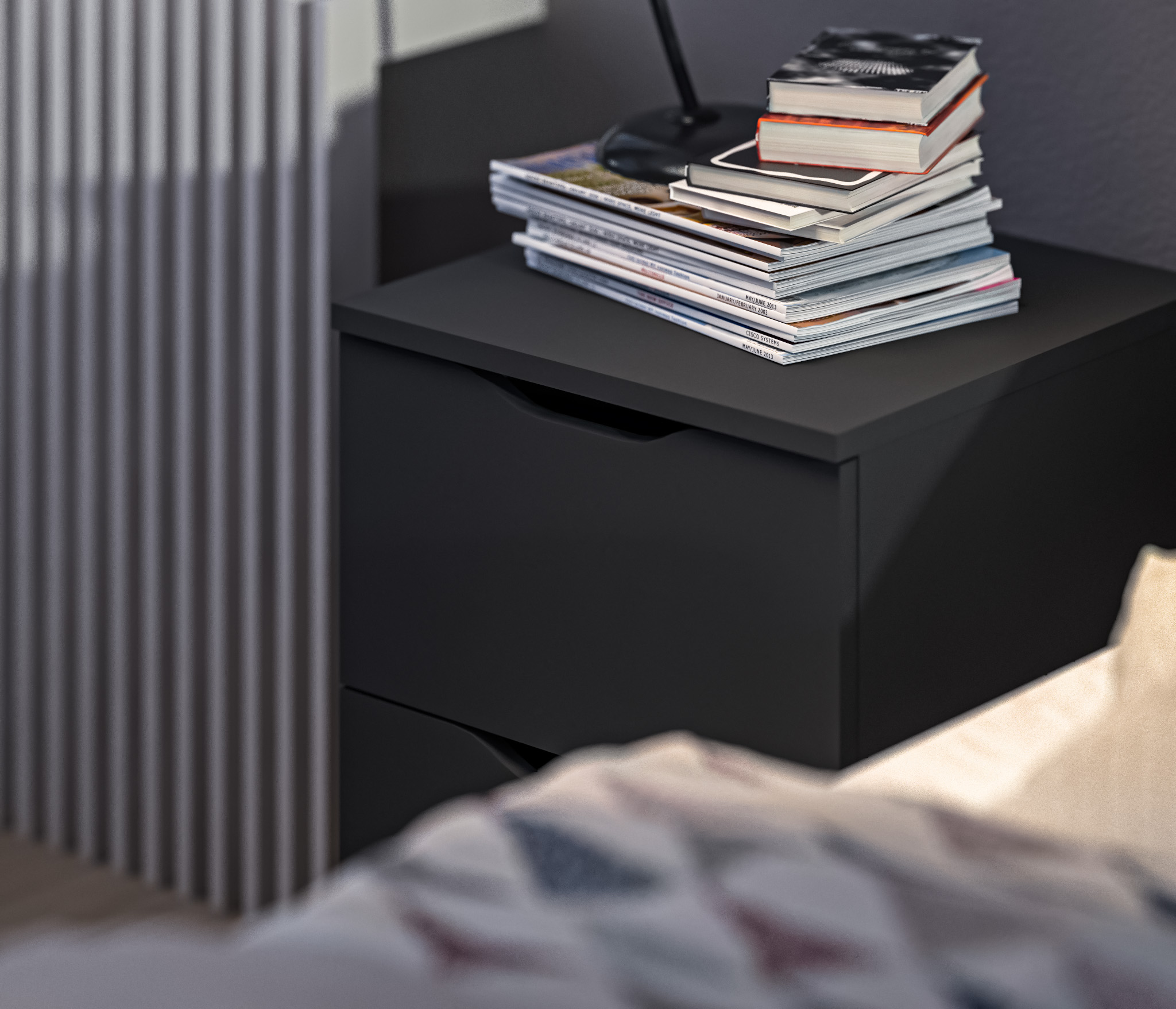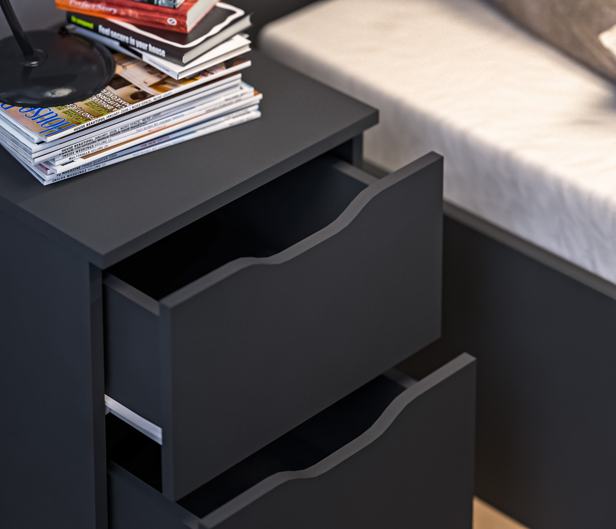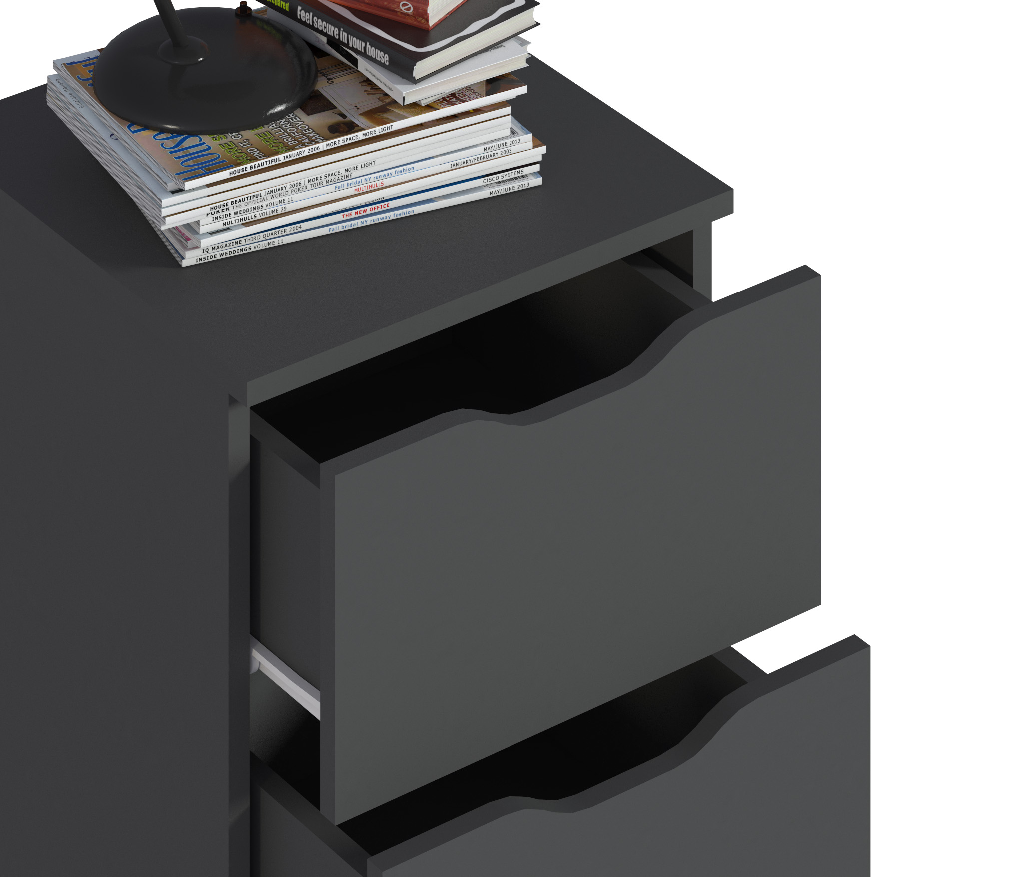 При компактных габаритных размерах – ширина 39 см, высота 53 см и глубина 39 см, тумба довольно вместительная. Под столешницей расположены два выдвижных ящика с прорезными ручками, где можно хранить вещи.