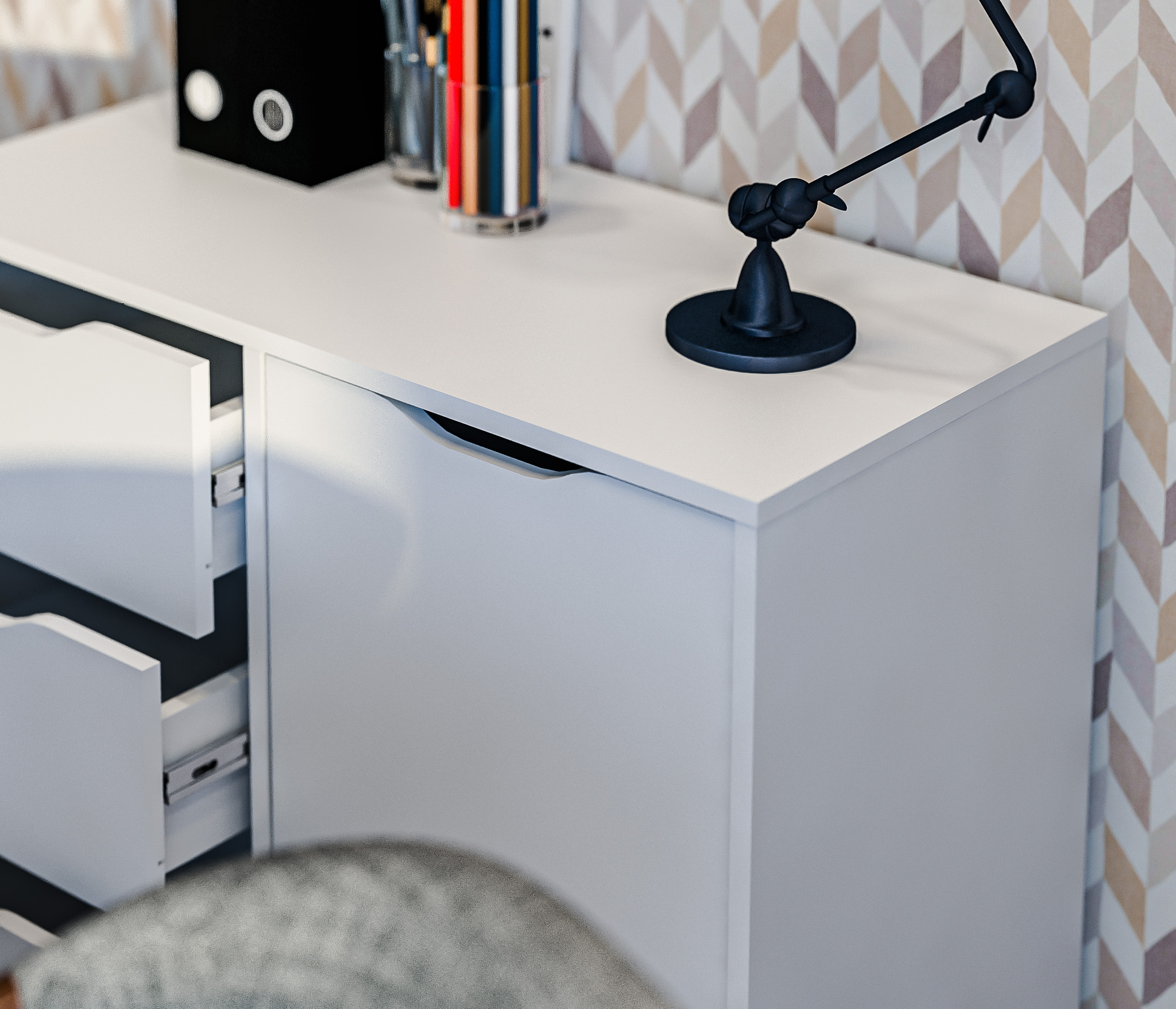 Комод Mika / Мика СБ-3282 – компактное и универсальное место хранения. Комод выполнен в современном сканди дизайне и является элементом модульного гарнитура Мика. Серия разработана для детских комнат или комнат подростков, хотя такой комод будет органичным и в офисе, и в кабинете. Габаритные размеры – ширина 85 см, высота 76 сам, глубина 40 см. Визуально комод можно разделить на две половины. Под одной дверцей расположено отделение с двумя полками. Другая половина оснащена двумя выдвижными ящиками и одним большим выдвижным ящиком на колесиках. Материал корпуса – ЛДСП с отделкой в цвете «Белый Альпийский». Фасады также из ЛДСП с комбинированной отделкой в цветах «Белый Альпийский» и «Серый перламутровый».