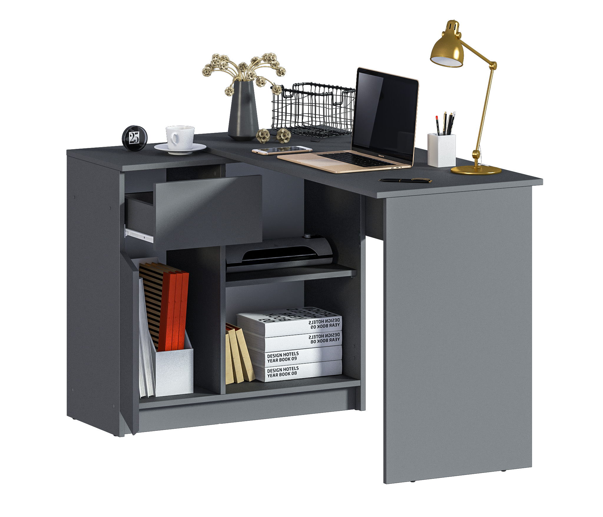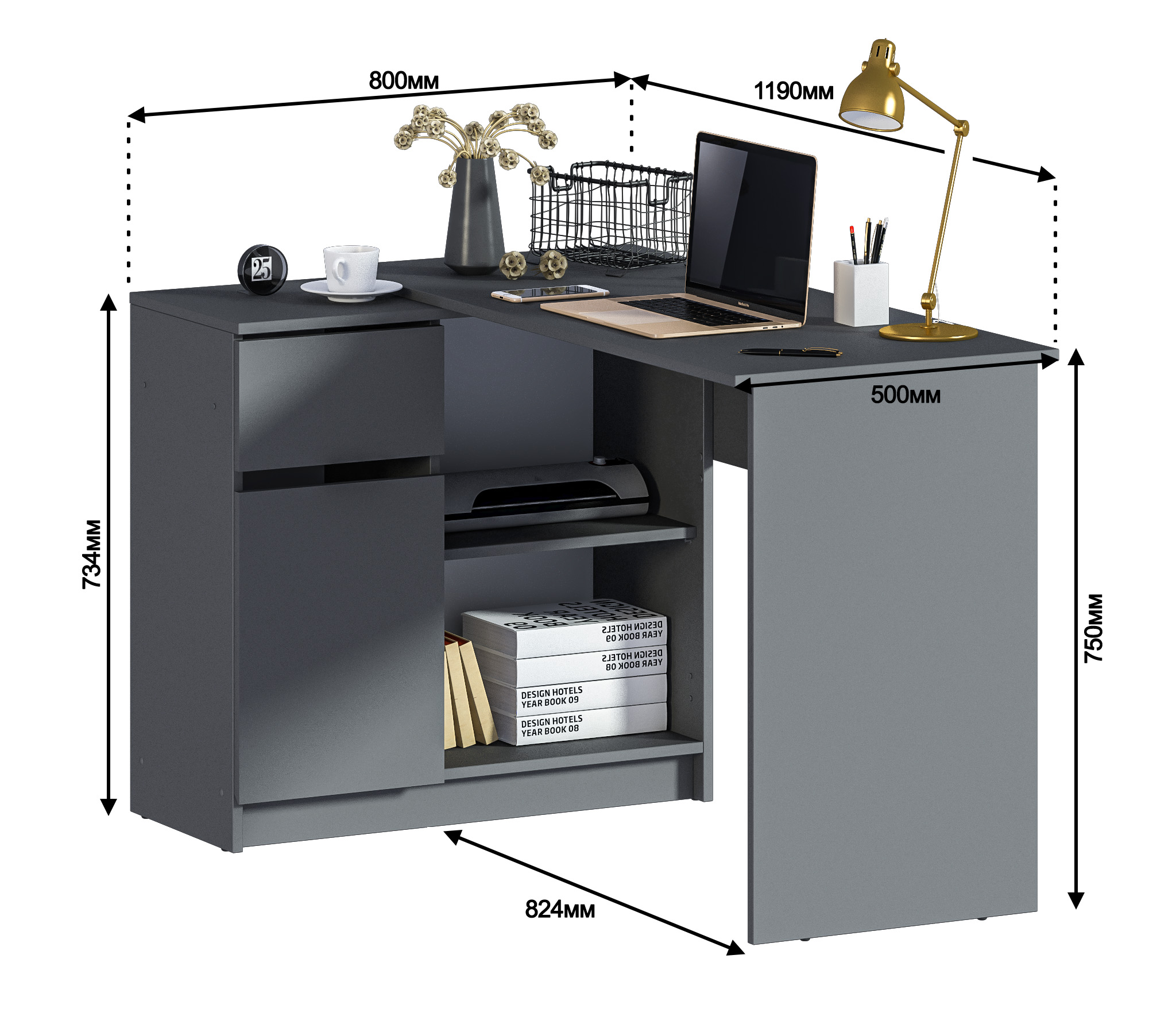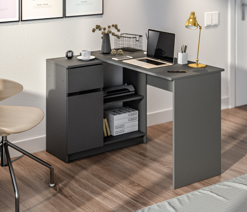 Габаритные размеры – ширина 119 см, высота 75 см и глубина 80 см. Под рабочей поверхностью расположена тумба с открытыми вместительными полками, а также выдвижной ящик и закрытое отделение с отдельной дверцей. Стол произведен из современного экологичного ЛДСП. Возможен как левый, так и правый вариант сборки.