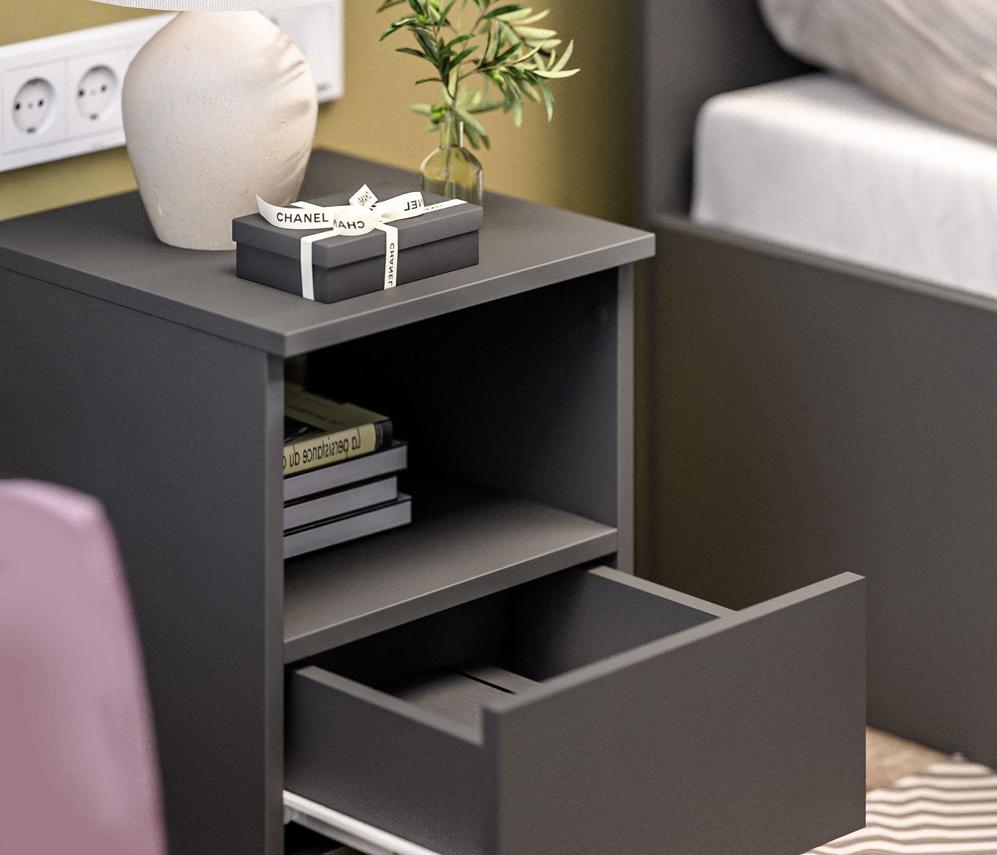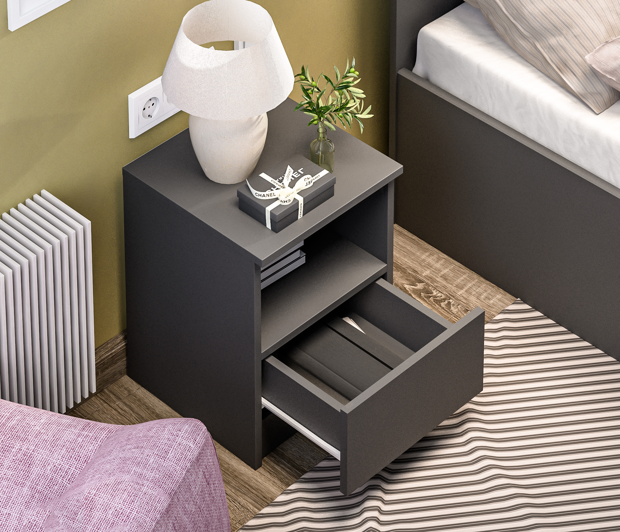 Прикроватная тумба Альфа СБ-2957, выполненная в минималистичном стиле, может быть частью гарнитура, а может быть отдельным предметом мебели. Тумба будет органично смотреться в спальне и детской.