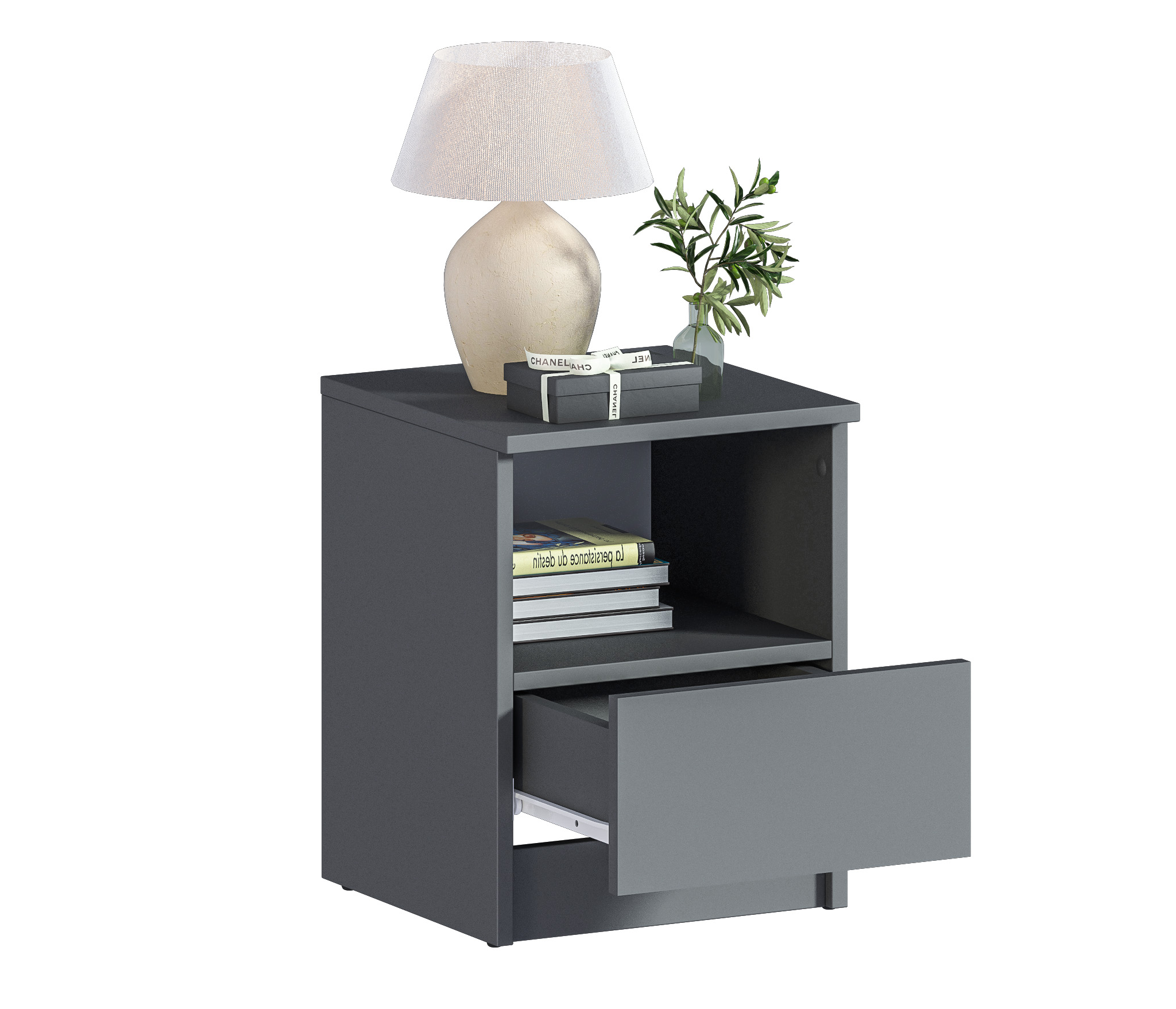 При компактных габаритных размерах – ширина 35 см, высота 44,4см и глубина 35,3 см, тумба довольно вместительная. Под столешницей расположены открытая полка и выдвижной ящик, куда можно положить планшет или книгу.