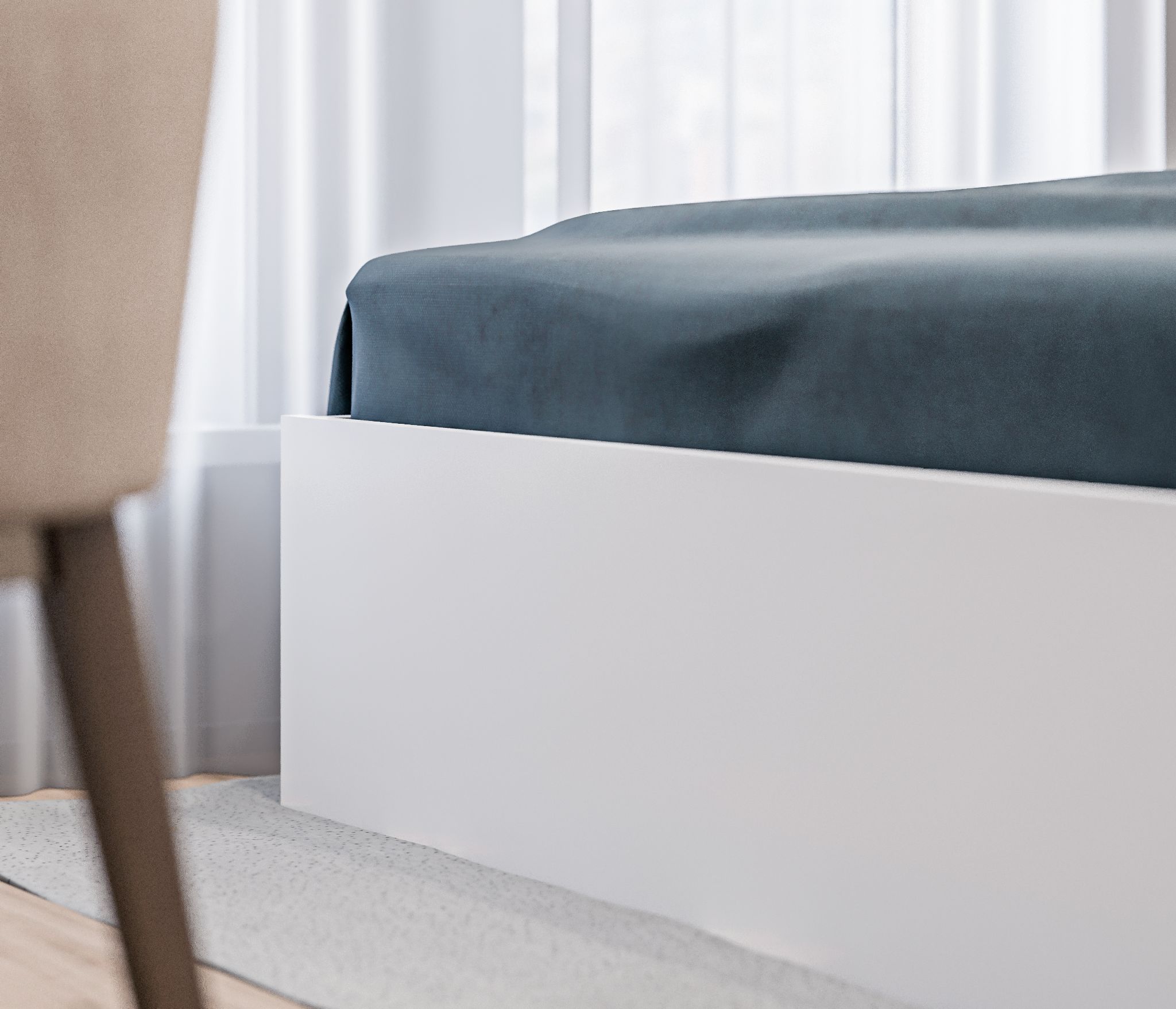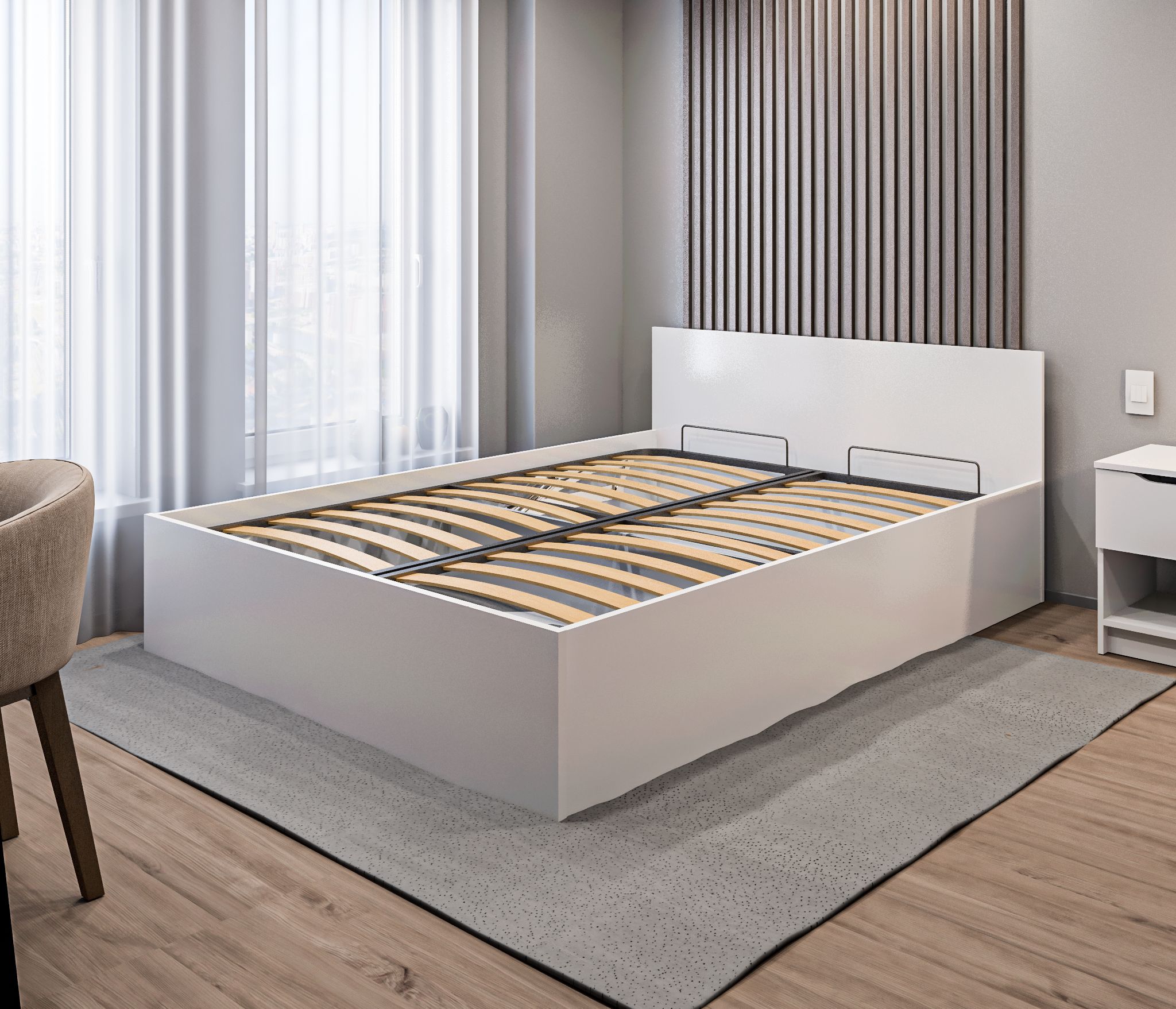 Качественный материал, минималистический дизайн, большое пространство для хранения, легкая сборка, удобно, что комплект кровати упакован в три разных коробки - легко перевозить и заносить в помещение в одиночку