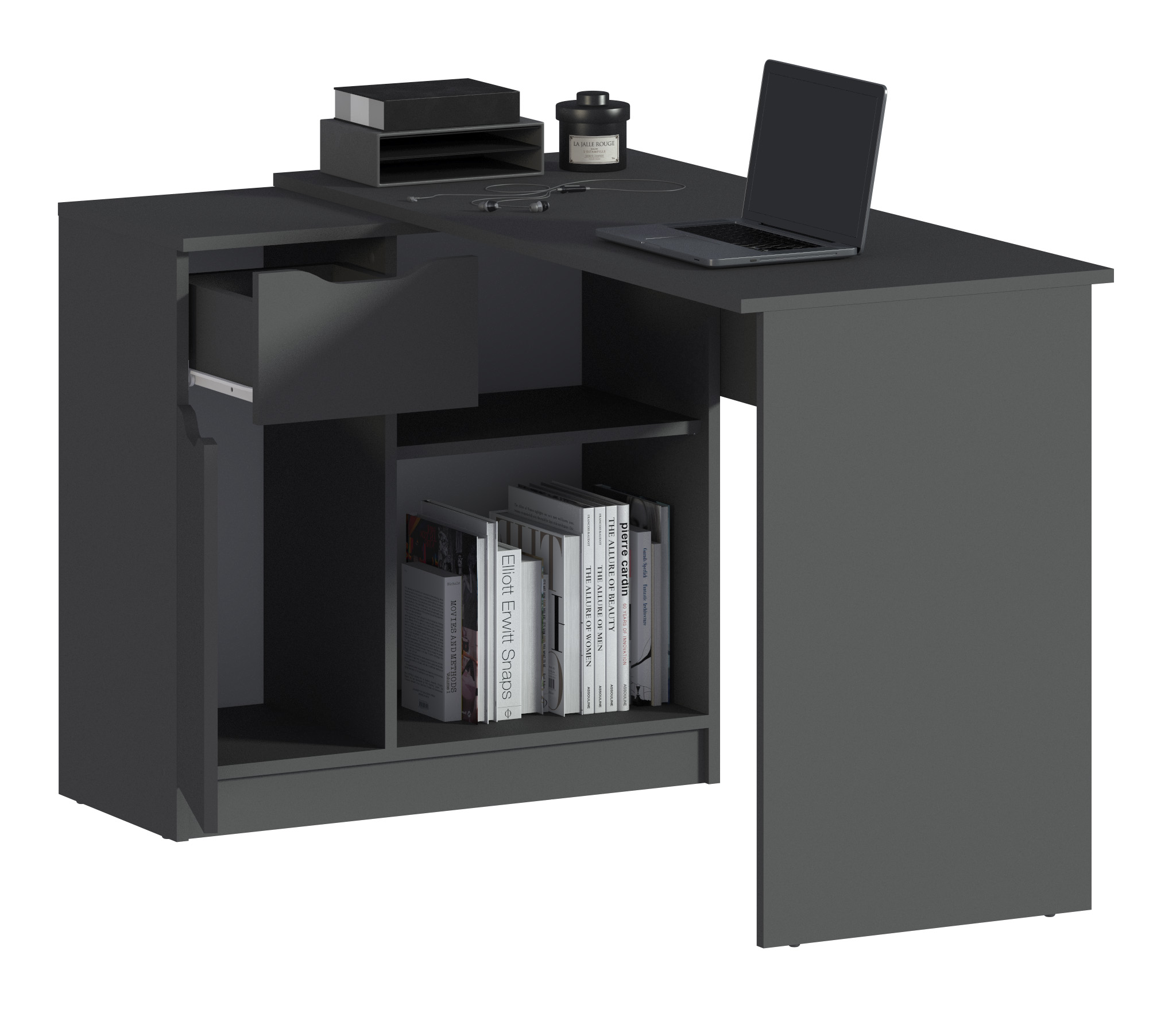 Стол оснащен одним ящиком и дверцей, которые предлагают удобное место для хранения канцелярских принадлежностей, документов и других необходимых предметов. Кроме того, имеется одна большая полка, которая предоставляет дополнительное пространство для размещения книг, файлов или других материалов.
