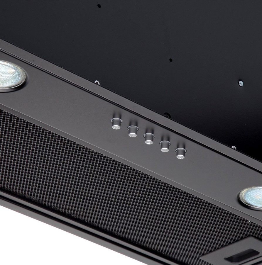 • Фасад вытяжки полностью закрывает нижнюю полку – это позволяет монтировать вытяжку в кухонные шкафчики вместо нижней полки (дна). Удобная система монтажа